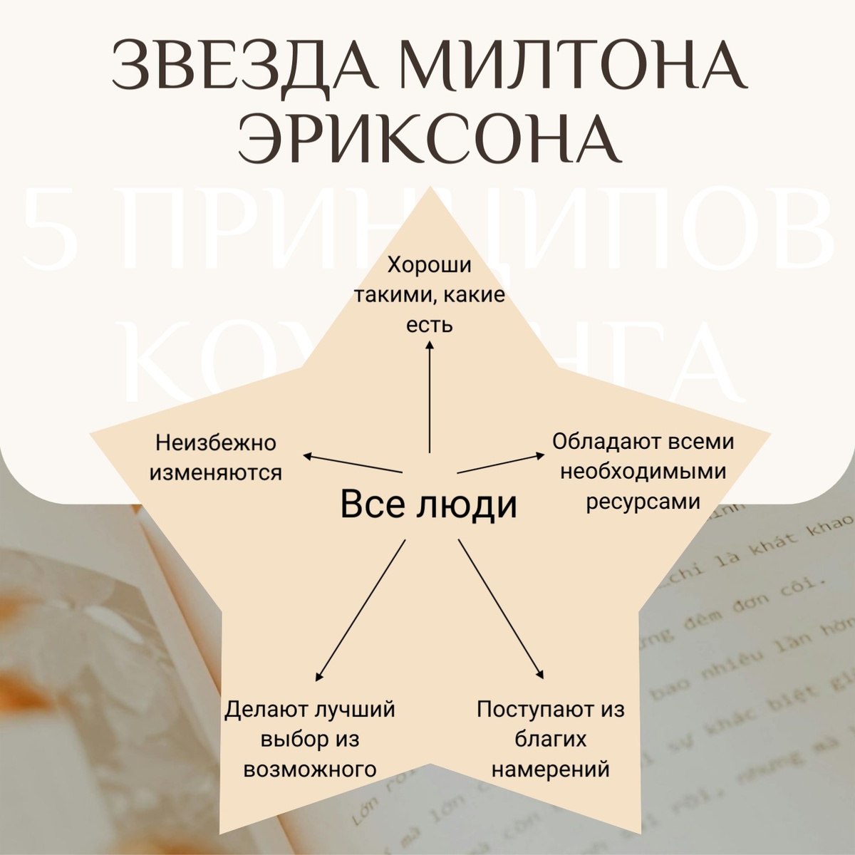 Звезда Коуча по Милтону Эриксону 🌟 — мощный метод, помогающий людям раскрыть свой потенциал. Её суть: 1. Все люди хороши такие, какие они есть. Я - ОК, мир - ОК. Со всеми все в порядке. Каждый человек уникален и ценен. Принятие себя и окружающих такими, какие они есть, создаёт основу для личного роста и гармонии. Это убеждение помогает преодолеть сомнения и строить позитивные отношения с собой и другими. 2. Внутри каждого человека уже есть все необходимые ресурсы для решения наших проблем и достижения целей. Важно научиться доверять себе и использовать свои внутренние силы. Коучинг помогает раскрыть эти ресурсы и направить их на путь к успеху. 3. Человек всегда делает наилучший выбор из тех, что может сделать в данный момент. Каждое наше действие – это результат нашего текущего состояния и возможностей. Понимание этого принципа помогает быть менее критичными к себе и другим, и более сострадательными и поддерживающими. Коуч помогает увидеть лучшие варианты и использовать их для роста.