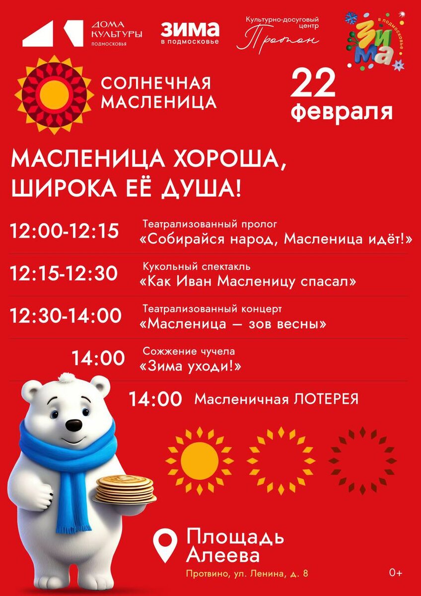✨ Масленица в Протвино 🥞 на площади перед КДЦ «Протон» ☀️12:00-12:15 Театрализованный пролог «Собирайся народ, Масленица идёт!» 🎭12:15-12:30 Кукольный спектакль «Как Иван Масленицу спасал» 🎶 12:30-14:00 Театрализованный концерт «Масленица - зов весны» 🔥14:00 Сожжение чучела «Зима уходи!» 🎁14:00 Масленичная ЛОТЕРЕЯ 🚫 Возраст: 0+ 📆 22.02.2026 🏢 КДЦ "Протон" 📍 г.о. Серпухов, г. Протвино, ул. Ленина, 8 💰 Вход свободный❗️ ⭐Поддержать канал голосом 💰 Канал Вакансии Серпухова ✅ Мероприятия Серпухов https://dzen.ru/id/66f01c6eb4c6fe60c9ca1608 http://vk.com/serpukhov_events http://dzen.ru/serpukhov_events