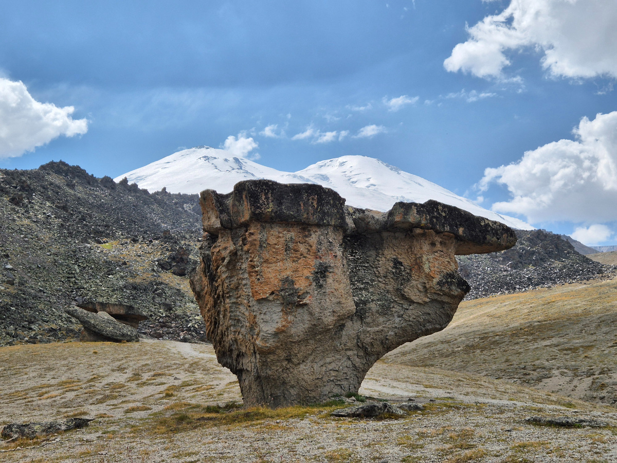 На северном склоне Эльбруса, в урочище Джилы-Су на высоте около 2500–2700 м, стоят каменные столбы высотой примерно 3–7 метров с массивными шляпками. Необычная форма появилась благодаря разной плотности вулканических пород: мягкие слои постепенно разрушались водой, ветром и морозом, тогда как более твёрдые блоки сверху защищали основание. Эльбрус — древний стратовулкан, и здесь хорошо видны следы его геологического прошлого: лавовые породы, туфы и пепловые отложения. Подобные эрозионные колонны встречаются редко, поэтому каменные грибы считают наглядным примером того, как выветривание формирует рельеф в высокогорной среде. Они расположены недалеко от акклиматизационных выходов на северном маршруте и служат местом стоянки по пути восхождения. Это место помогает буквально увидеть вулканическую историю Эльбруса и работу природных сил, меняющих горы тысячелетиями. Мы увидим Каменные грибы в туре на Эльбрус с севера! И даже переночуем и погуляем там, сделаем кадры на память, а затем пойде