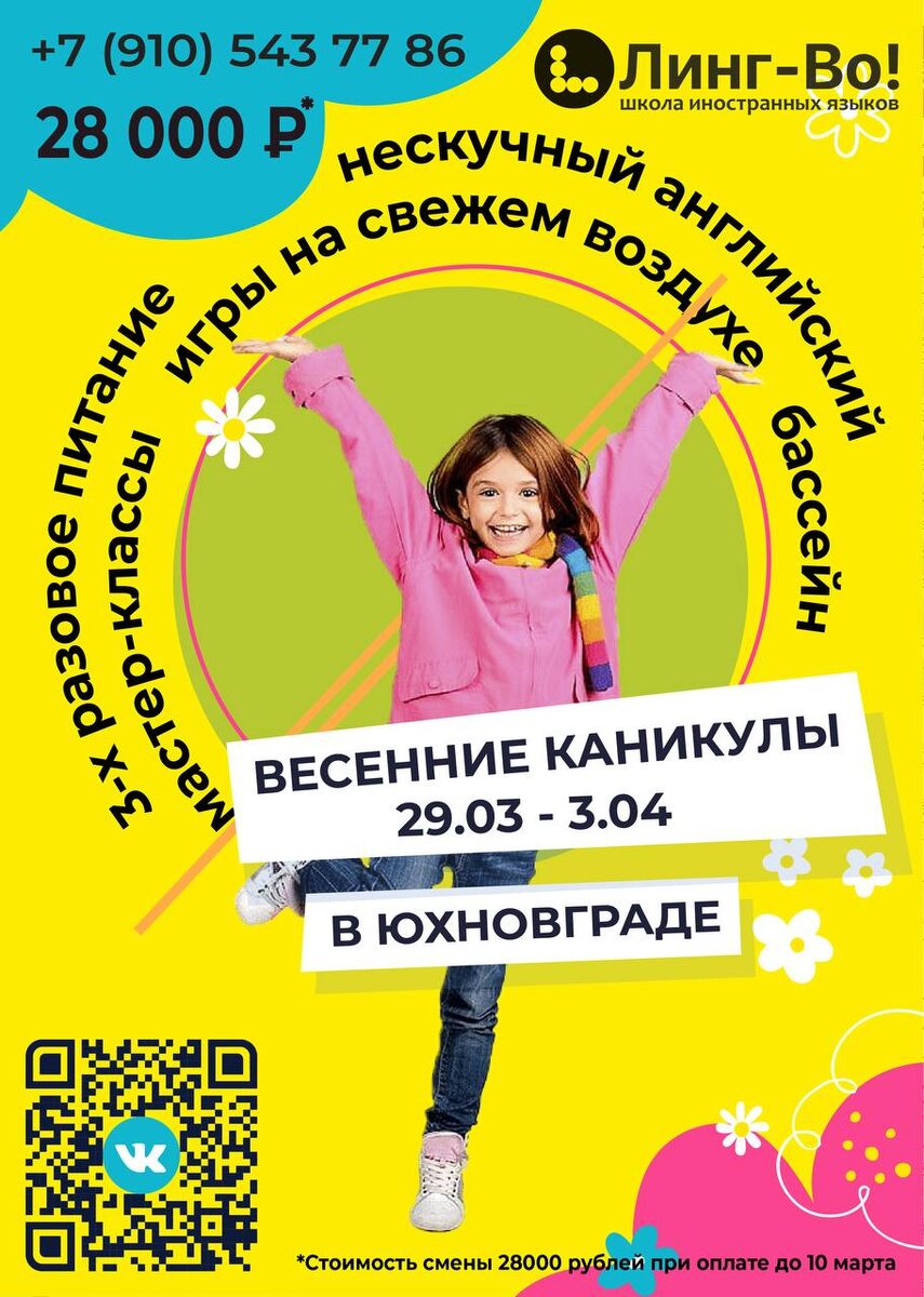 ! Обратите внимание ‼️ Мы подготовили новое предложение: весна вашего ребенка в Юхновграде! Что это такое? Это весенние каникулы на природе, где есть друзья, заботливые вожатые, и даже бассейн 🏊 Бронируйте радость☝️ 📱 +7 (910) 543-77-86