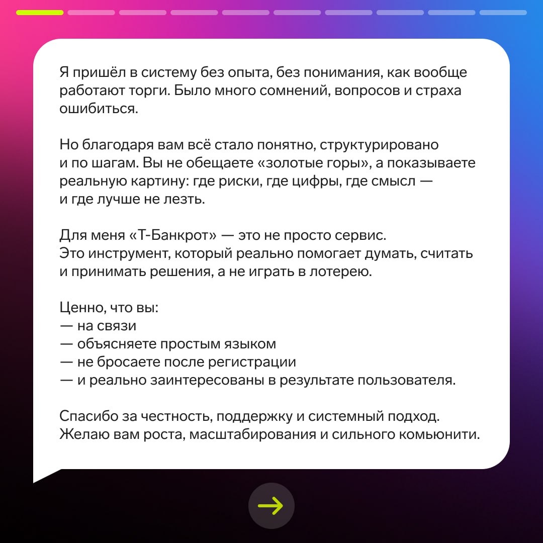 Мы получили от вас сотни поздравлений и теплых слов. Спасибо каждому за искренность и доверие к нашему сервису! Собрали несколько поздравлений, которые нас особенно вдохновили. Читайте их в карточках к посту. 🚀 Мы продолжаем развиваться и совершенствовать инструменты TBankrot, чтобы ваши сделки на торгах становились еще проще и прибыльнее. Спасибо, что вы с нами 💚