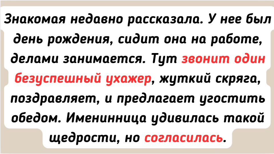 - Знакомая недавно рассказала. У нее был день рождения, сидит она на работе, делами занимается. Тут звонит один безуспешный ухажер, жуткий скряга, поздравляет, и предлагает угостить обедом. Именинница удивилась такой щедрости, но согласилась. Сели в машину, и он привез ее в какую-то рабочую столовую, где надо себе еду на поднос собирать. И такой: «Угощайся, дорогая! Бери что хочешь! А я есть не буду, я дома поел». © Тревожное Пирожное / ADME