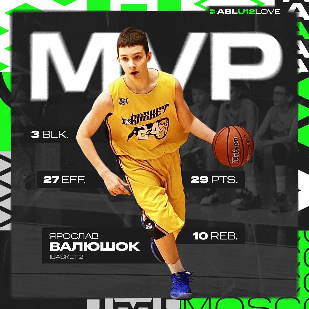 Валюшок Ярослав (IBasket 2) vs Лобня U12 Love 13 тур 47:44 29 очков, 10 подборов, 3 блок-шота, 27 эффективность IBasket 2 проигрывали "Лобне" на протяжении всей встречи, но во второй половине игры начали перехватывать инициативу. Ярослав Валюшок забил 20 из 29 очков команды в третьей и четвертой четверти. Ярослав показал солидную реализацию (10/22 2-очковые и 9/12 штрафные) и разностороннюю игру, став лидером команды по набранным очкам, подборам, передачам и блок-шотам. За 54 секунды до конца матча при счете 41:41 Валюшок забил решающий бросок и принес IBasket победу. 📱Наш сайт 📱Группа Вконтакте 📱MAX 1️⃣@ABL Moscow