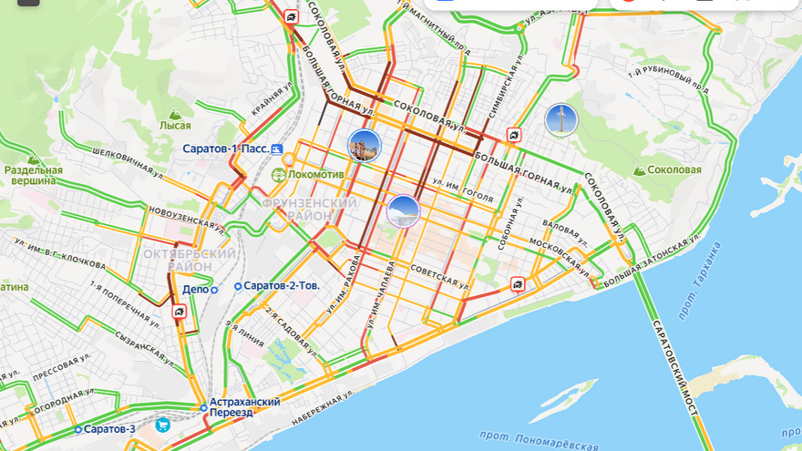 Сегодня вечером в Саратове образовались пробки. Сервис Карты.Яндекс оценил их на 8 баллов из 10. В центре города стоят улицы Астраханская, Горького, Рахова, Чапаева, Рабочая, Симбирская, Чернышевского. Из-за ДТП у остановки «3-й Товарный проезд» движение парализовано на улице Политехнической. В Заводском районе заторы наблюдаются на Ново-Астрахнском шоссе, улицах Пензенской и Орджоникидзе. Также машины еле движутся по Тульской. Традиционно стоит проспект 50 лет Октября в микрорайоне Стрелка. Не лучше ситуация на улицах Соколовой и Шехурдина. В Ленинском районе движение парализовано на улицах Тархова и 2-й Прокатной. Ситуацию на дорогах осложняют мелкие ДТП и работы коммунальщиков.