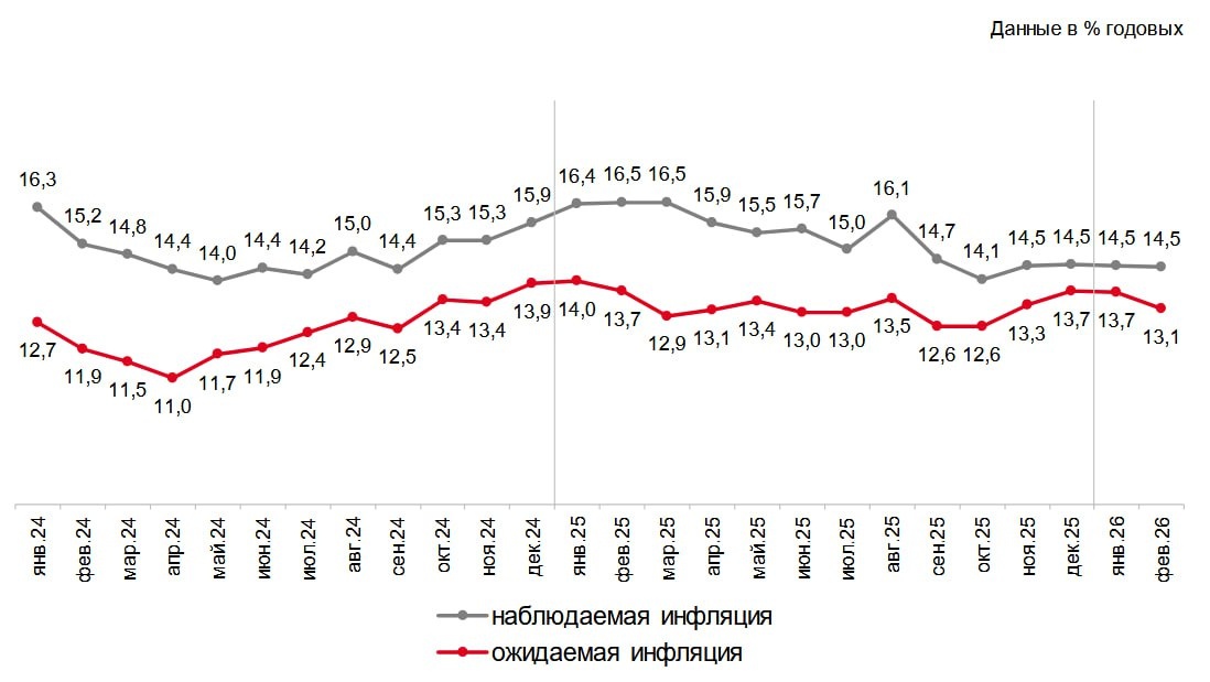 Наблюдаемая инфляция уже 4 месяца «залипла» на одном и том же уровне — 14,5%. Данные инФОМ по заказу ЦБР. Росстат тем временем сообщает о снижении инфляции до 5,6% в декабре 2025. ЦБР пишет о 6% в январе 2026. Росстат занизил декабрьскую инфляцию до 0,32% (к предыдущему месяцу), но январской скрыть уже не смог — 1,62%. Колебания инфляции в 5 раз. ЦБР выдумывал самые разные объяснения - от действия «разовых факторов» до переноса инфляции с декабря на январь. Население этих колебаний вовсе не заметило. Как и «снижения инфляции» Росстатом в конце 2025 года по заданию Путина. По мнению людей, инфляция в 2,5 раза выше официальной и держится на таком уровне (или даже немного выше) последние 2 года. В какую цифру по январю 2026 вы верите? 6% к прошлому году 14,5% к прошлому году См. Ставки сделаны: 15,5% *** Канал «Призрак экономики» - самый нескрепный экономический канал в Телеграме.