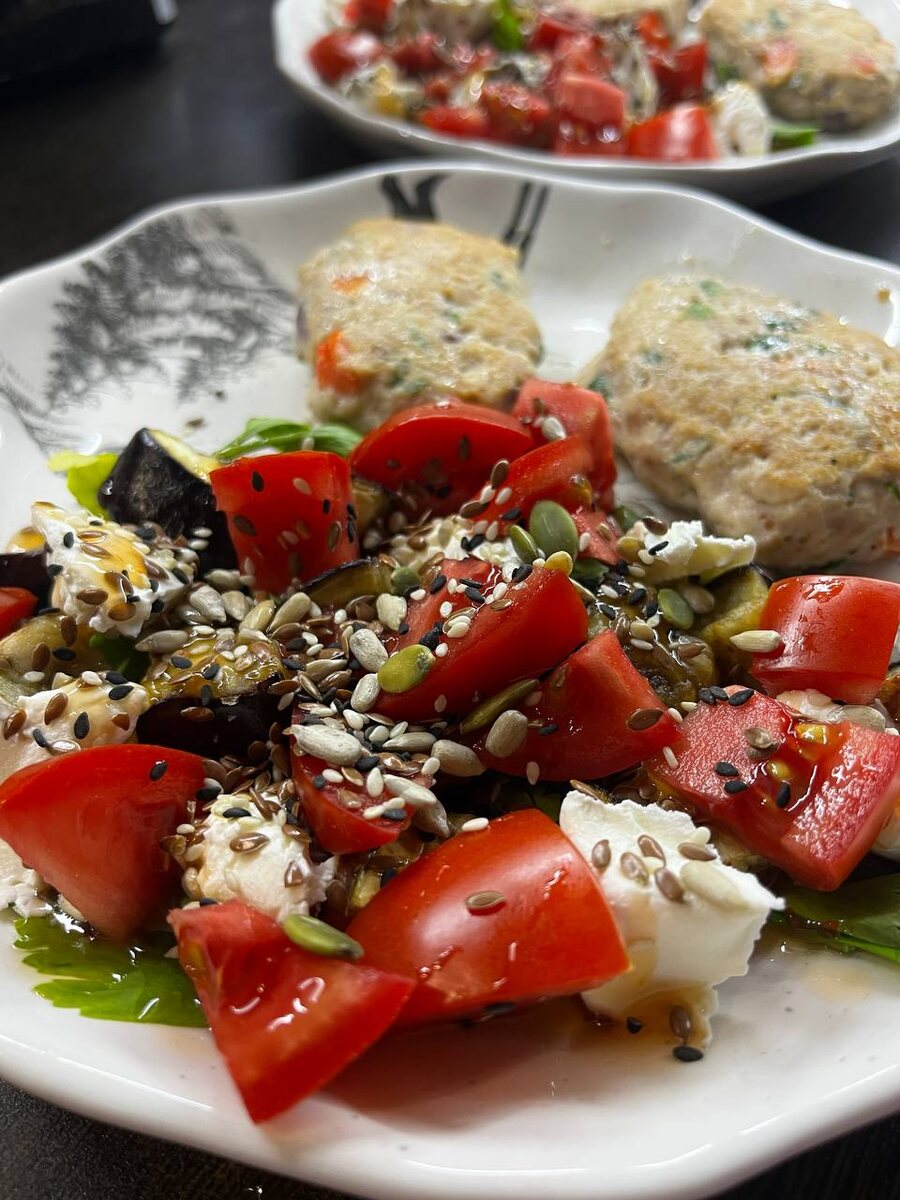 Подборка быстрых рецептов для тех, кто ценит вкус и время. Каждое блюдо готовится меньше чем за 15 минут — просто, удобно и без лишних ингредиентов. Здесь собраны завтраки, обеды, ужины, закуски, салаты и десерты. Заберите подборку рецептов в боте — и готовьте вкусно, даже когда времени совсем немного 🍆🍆🍆 Обожаю этот салат с жареными баклажанами. Обычно беру его в грузинских ресторанчиках, но там баклажаны готовят во фритюре. Я не готова доставать фритюр и жарить их таким способом — для меня это слишком. Поэтому сделала более лёгкий вариант. Ингредиенты: • баклажан — 1 шт. • помидоры — 2 средних • петрушка или кинза — примерно 20 г (на 2 порции) • творожный сыр — 20–30 г • семечки — 1 ст. л. • соус сладкий чили — 1 ст. л. • крахмал — немного • соль • подсолнечное масло — 1 ст. л. Как готовить: • Баклажан нарезаем квадратиками. • Солим и оставляем на 10–15 минут, чтобы он дал сок. • После этого слегка обваливаем кусочки в крахмале. • Обжариваем на разогретой сковороде с подсолнечным