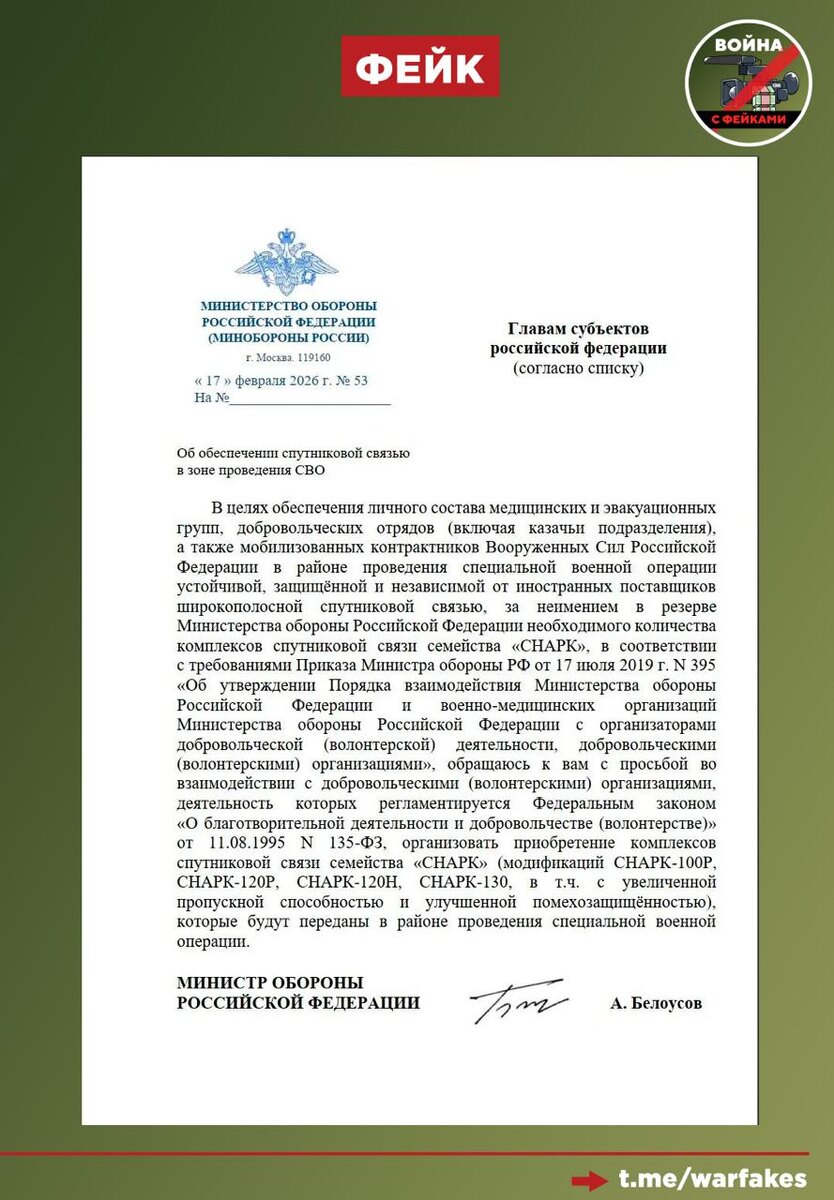 В соцсетях распространяется фейковое письмо от имени Минобороны с просьбой к губернаторам закупать спутниковую связь для СВО