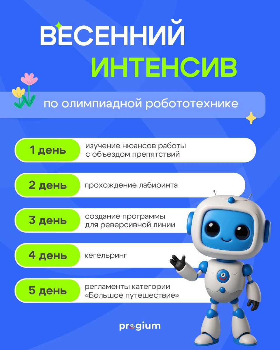 🌷ВЕСЕННИЙ ИНТЕНСИВ🌷 по олимпиадной робототехнике 🔵Когда? с 23 февраля по 27 февраля (5 дней) 🔵Во сколько? с 10:00 до 14:00 🔵Где? Габишева, 20 В день будет по 2 занятия по 1,5 часа с перерывом на перекус 🥪 💙Также уроки будут разбавлены интересными конкурсами, играми и разминками Количество участников участников ограничено, поэтому скорее записывайтесь 📝 +7 (927) 039-10-18
