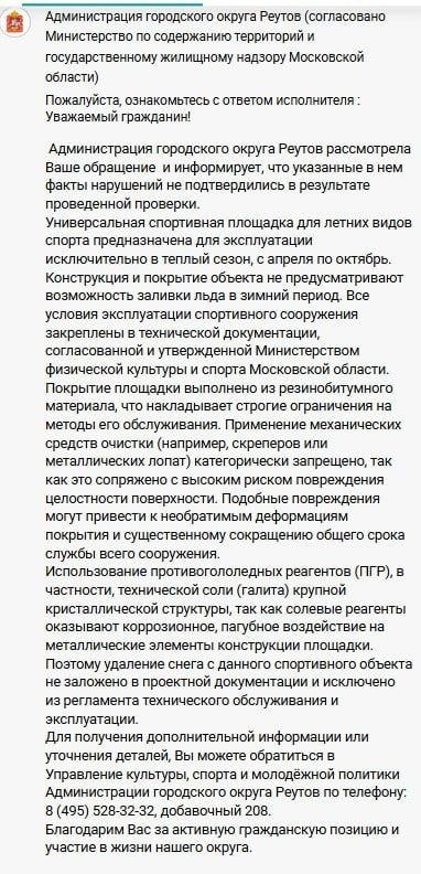 Реутово. Хоккейная площадка на ул.Победы 15 не заливается и не чистится а завалена зимой снегом. Есть протокол подведения итогов электронного аукциона № 0848300044119000191 подписанный представителями администрации города Реутова (ссылка https://www.rts-tender.ru/poisk/search/?id=87ae3bc4-e2a9-48b4-ab53-0a8315beaaad) и Техническое задание в котором четко написано ХОККЕЙНАЯ ПЛОЩАДКА, а также в СМИ не раз заявлялось что площадка всесезонная! Когда она вдруг перестала быть хоккейной и откуда появилось правило что ее зимой нельзя использовать, на основании каких документов? #отподписчиков «Мой Реутов» в MAX: https://max.ru/reutov_today