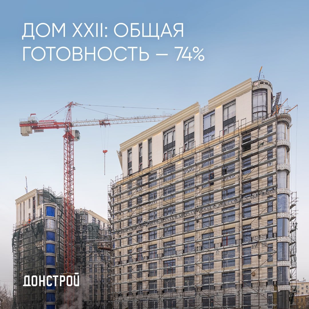 » Клубный «Дом XXII» приобретает свой величественный и элегантный облик. Работы здесь идут в соответствии с графиком: ▫️общая готовность составляет 74% ▫️продолжаются фасадные работы: завершается установка кронштейнов — 97% и монтаж утеплителя — 87%, монтируется вентилируемый фасад — 59% и натуральный камень — 60%; ▫️продвигаются работы по остеклению: на финальной стадии установка окон — 99%, продолжается работа по установке витражей — 75%; ▫️на финишной прямой работы по устройству инженерных сетей в подземной части — 98,5%. Производится программирование автоматизации здания. Проложен силовой кабель, завершается устройство наружной сети водостока. Чистовая отделка выполнена на 56%; ▫️проводится укладка керамогранита в общих пространствах будущих жилых этажей, завершается устройство потолков типовых этажей. Начата установка дверей резиденций и мест общего пользования; ▫️застройщик приступил к укладке мрамора в лобби — пространство площадью 660 м² будет впечатлять своим масштабом