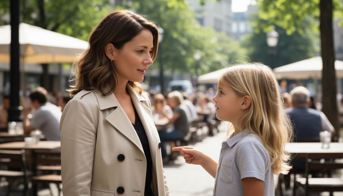 В этот момент Елена случайно перевела взгляд в сторону и увидела ту самую девочку, которая пела у ресторана. Она стояла неподалёку и, не отрываясь, смотрела прямо на неё. Взгляд у девочки был не по-детски серьёзным и внимательным. Неожиданно для всех Полина подошла ближе к их столику и, глядя на Елену, отчётливо произнесла:
