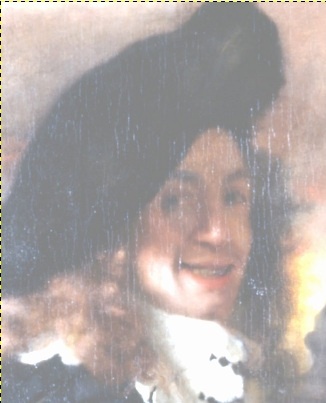 Я: Вообще-то точки есть и в "Девушке с жемчужиной". Только они маленькие. Их маленькое скопление на зубах. Это насмешка над столь чтимой протестантами простотой. Серёжка-то явно не про её, бедной, честь. Она взволновалась, её надев. Аж рот приоткрыла. Это должно умилить протестанта, который весь Тут. Но не католика, который вечно Там. Есть в её левом углу губы и как бы неоправданная большая белая точка. Может, правда, это блестит потекшая изо рта слюна. Так перестала себя контролировать от ТАКОЙ красоты серёжки. Это, в некотором смысле, садизм богатого - дать на время надеть ТАКОЙ ТАКОЕ. Есть 5 точек в ноздре, пара-тройка в обоих глазах, полно на спине (там тень, а платье, судя по отсутствию вышивки, бедное - служанке не шибко платят, чтоб той шиковать с материей). И на синей части головного убора много мельчайших точек. Заставить надеть тюрбан - такая же придурь богатого хозяина, как и надеть на бедную серёжку. И есть совсем тонкое издевательство. Некрасива девушка. Не то, что девушки в Италии. Католической. Сухость жизни мстит.