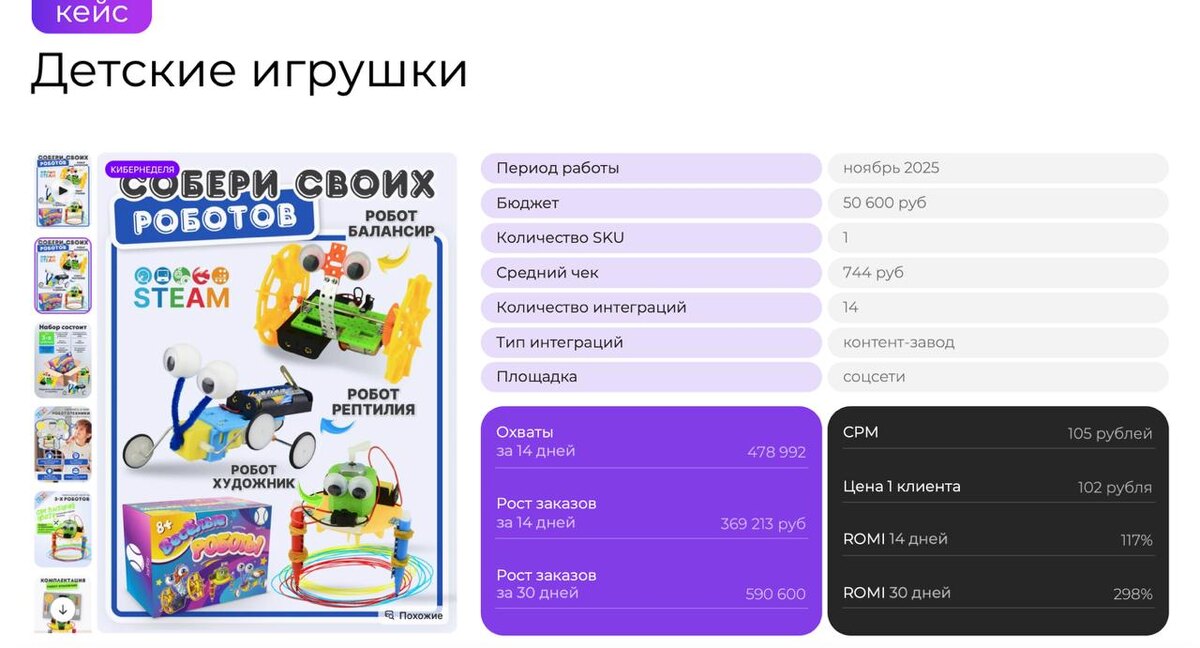 CPL = 102₽ Значит, в ноябре ко мне приходит продавец детских игрушек на WB. И вот такая ситуация, знакомая многим: ❌ Вложил в рекламу 300 тысяч ❌ Получил всего 40 заказов ❌ CPL = 7500 рублей (!!!) ❌ Окупаемость 23% Ну то есть слив бюджетов просто классический, да. Знакомо? Мы с командой собрали контент-завод. Причём использовали третий тип — сеть аккаунтов. Почему? Потому что это самый быстрый способ разгона. Вот что сделали за 2 недели: ✅ 15 креативов в день выкладывали ✅ 3 площадки задействовали (ИГ, ТТ, ЮТ) ✅ 15 микроблогеров наняли (мамочки с 3-10К подписчиков) ✅ 2 креаторов подобрали на съемку UGC-контента ✅ Настроили все воронки 📊 РЕЗУЛЬТАТЫ через месяц работы (было-стало): CPL (цена 1 заказа) 7500₽ 👉 102₽ Конверсия 1,2% 👉 31% ROI (окупаемость) 23% 👉 287% Заказов, шт 40 👉 793 💡 Инсайт, который я хочу до вас донести: Секрет не в бюджете. Секрет в СИСТЕМЕ. Контент-завод — это не когда вы там один вирусный пост ловите, да, а когда у вас конвейер из сотен микро-касаний с