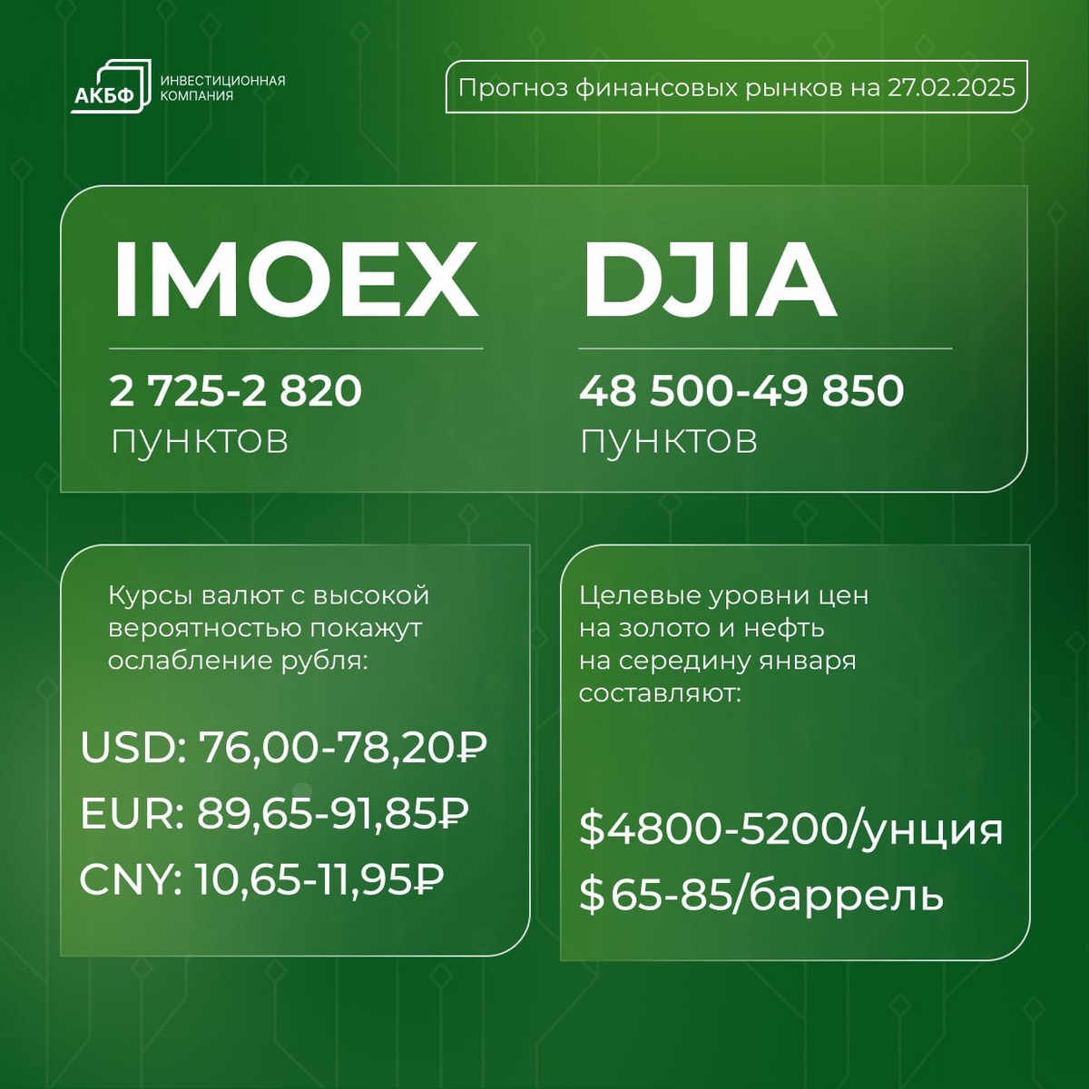 Ожидаем, что третья декада февраля пройдет в условиях повышенной неопределённости. Доходности ОФЗ остаются у верхних границ диапазонов, валютные курсы приближаются к справедливым уровням, а инвесторы постепенно смещают фокус на акции. Именно в эти дни формируются ожидания на первую неделю марта. В перспективе ближайшей недели по широкому сегменту ОФЗ преобладают шансы роста доходностей. При этом уже по итогам недели, начинающейся 2 марта, ожидаем их снижение. По выпуску ОФЗ 26226 целевой усреднённый уровень на конец следующей недели по-прежнему оценивается в диапазоне 14,15–14,70% годовых. В феврале вероятно итоговое повышение доходностей по индикативным выпускам 26229, 26226, 26224, 26225 и 26240. В марте 2026 года ожидаем их снижение. С учётом макроэкономической статистики и текущей рыночной динамики справедливый диапазон ставок на ближайший месяц остаётся в пределах 13,30–15,50% годовых. По итогам предстоящей недели преобладают шансы роста российского и американского рынков акций. Н