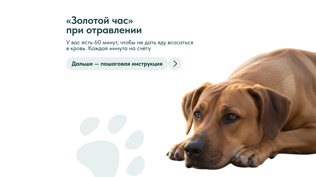 Отравление развивается стремительно. У владельца есть 60 минут, чтобы не дать яду всосаться в кровь и добраться до ветклиники. Рассказываем, как действовать без паники и каких ошибок нельзя допускать. Большинство ядов начинают всасываться через слизистую желудка уже через 15-20 минут. Изониазид, которым догхантеры травят собак, запускает судороги за 30-40 минут после попадания в организм. Крысиный яд нарушает свертываемость крови — внутренние кровотечения могут начаться через несколько часов, но процесс уже не остановить. Первый час — это окно, когда яд еще можно нейтрализовать или хотя бы замедлить его действие. После этого начинается борьба не с отравлением, а с его последствиями: отказом почек, печеночной недостаточностью, поражением нервной системы. Симптомы зависят от типа яда, но есть универсальные маркеры. Внезапная слабость или шаткая походка у питомца, который минуту назад был активен, — первый сигнал. Обильное слюнотечение или пена из рта указывают на поражение нервной сист