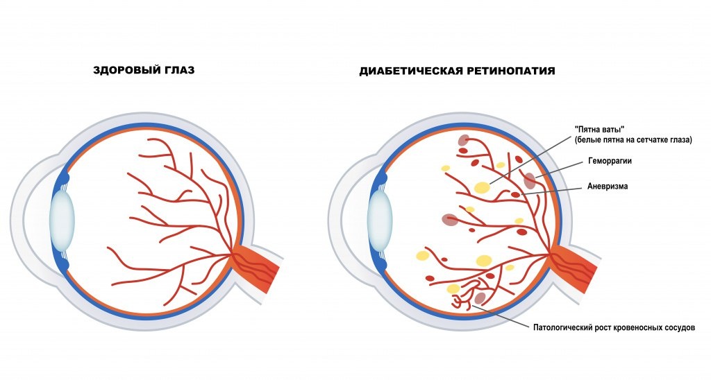 Глюкоза в крови — вещество химически активное. Когда ее слишком много, она начинает разрушать стенки сосудов изнутри. Сосуды становятся ломкими, протекающими, закупориваются. Глаз пытается спасти положение и выращивает новые сосудики, но они получаются хлипкими и неправильными. И вот этот замкнутый круг рано или поздно приводит к тому, что человек перестает видеть.
