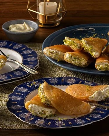 😆😊 февраля — Тёщины Вечёрки (почему такое классное название писала в прошлом году!) После максимального количества праздников этой недели осталось отметить начало священного месяца Рамадан 18го февраля. С православным Великим постом не совпало всего лишь на несколько дней (начинается в понедельник 23го февраля). Но без сладкой темы и здесь не обойдёмся! Вкушать пищу в Рамадан можно после молитвыМагриб (приём пищи — Ифтар), а одним из популярнейших десертов в этот период является Катаеф (или Атайеф) — представляет собой небольшие дрожжевые блинчики с начинкой. Обычно их делают в форме полумесяца и обжаривают только с одной стороны. Благодаря этому одна поверхность получается пористой (чтобы лучше впитывать сироп), а другая — гладкой и липкой, что позволяет легко скреплять края 🌷 Также на столе часто можно найти лукаймат, кунафу, пахлаву, басбуса (пирог из манной крупы), Умм Али и, конечно же, финики! Десерты часто выкладывают в форме полумесяца, а на прилавках появляются такие п