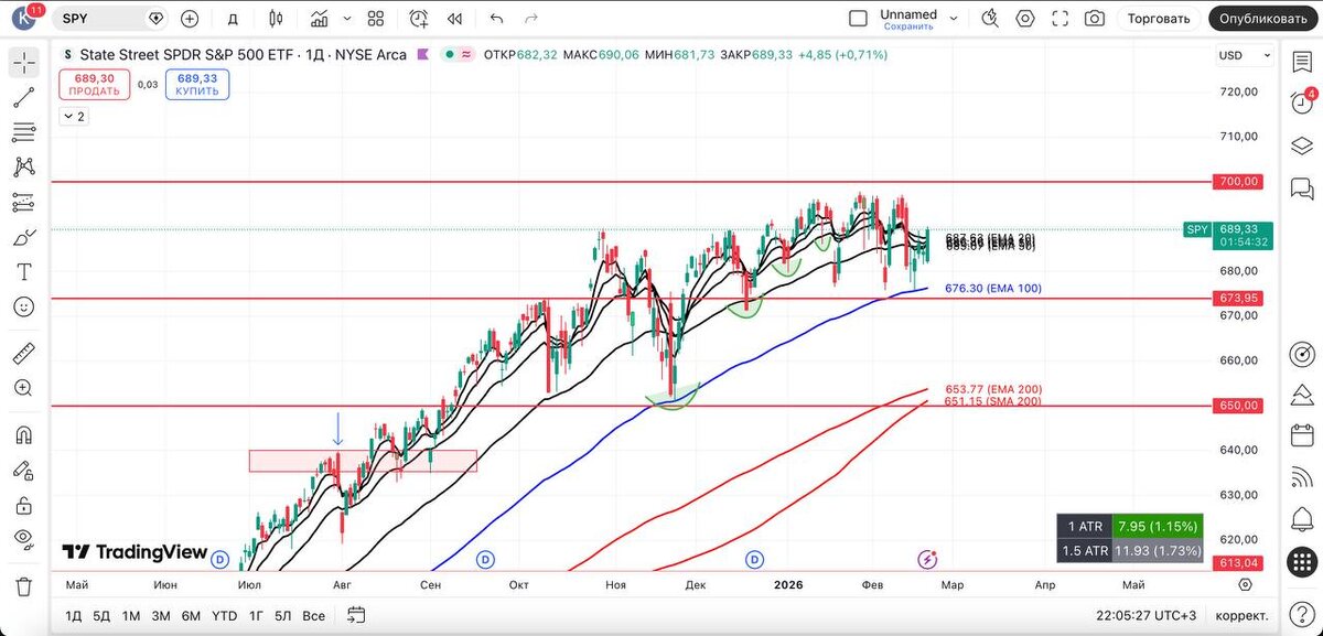 В данный момент видим, как $SPY возвращается за все скользящие, а $QQQ — за 20 EMA W = это небольшой позитив