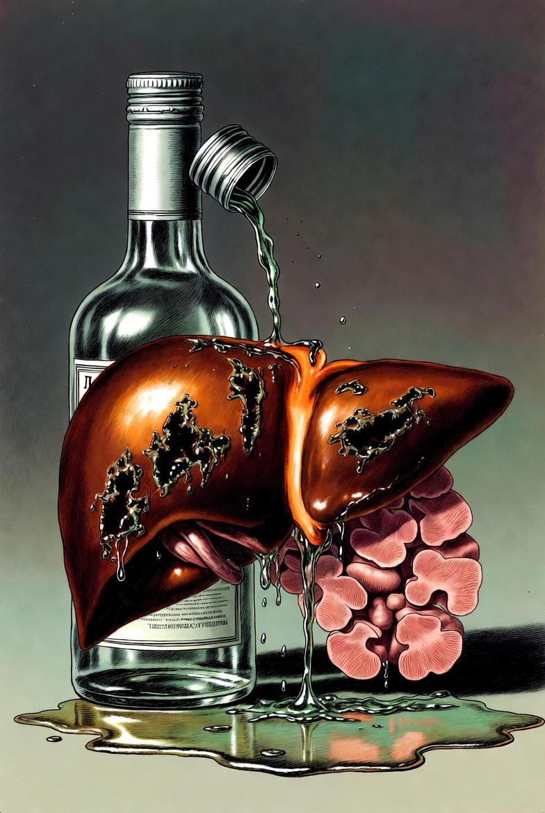 Водка с её 40% содержанием спирта — это концентрированный токсин. Она всасывается в кровь быстрее всего, и печень получает одномоментно высокую дозу этанола. Ферментные системы работают на пределе, не успевая перерабатывать ацетальдегид — тот самый яд, который разрушает клетки печени.