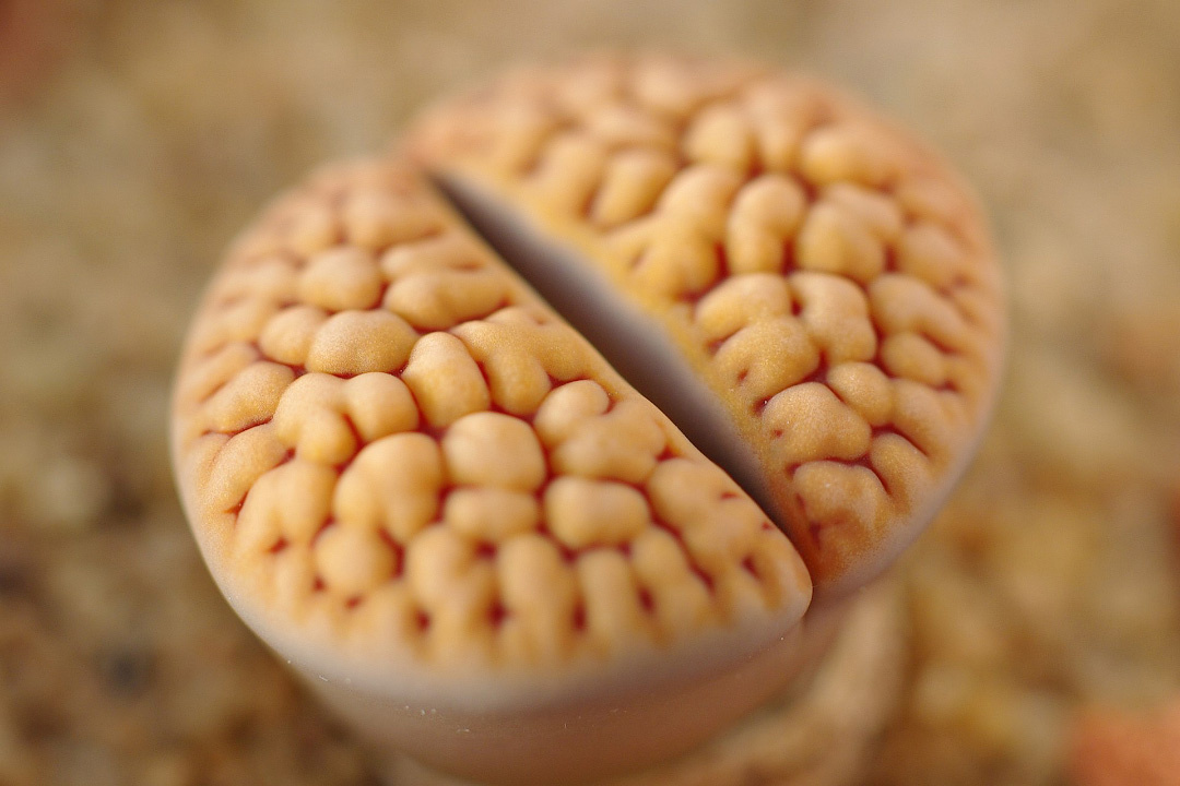 Привет, мои дорогие любители необычной земной природы. С вами, как всегда, ваш гид в мире живой материи с планеты… впрочем, вы вряд ли запомните или произнесёте её название. Неважно. Сегодня у нас необычные гости. Когда я впервые их увидел, я подумал, что это дети разумных кактусов с Альдебарана, которых все из нас знают, а кто-то даже имел удовольствие общаться. Но оказалось, что сходство, пусть и поразительное, случайно. Это гость с Земли. Итак, знакомьтесь — литопс (Lithops). Название переводится как «каменное лицо», и в этот раз ботаники не приукрашивают действительность. Перед вами действительно два мясистых листа, разделённых щелью и почти полностью спрятанных в почве. Несмотря на сходство с мозгом, растение, увы (а может, и к счастью), неразумно. Литопсы относятся к суккулентам, то есть к растениям, умеющим накапливать и удерживать влагу в своих тканях. И это, согласитесь, весьма полезное умение, если вы обитаете в суровых условиях пустыни. Их родной дом — пустыни Намиб и Калаха