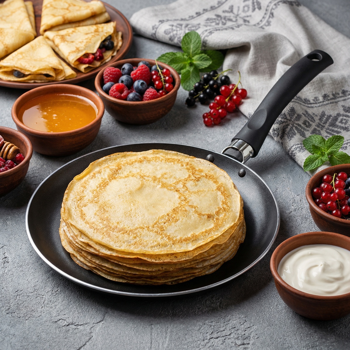 Эластичные, не рвутся и легко сворачиваются — удобно фаршировать творогом, мясом, грибами или сладкими начинками. ✅ молоко — 500 мл ✅ яйца — 2 шт. ✅ мука — 200–220 г ✅ сахар — 1 ст. л. ✅ соль — ½ ч. л. ✅ растительное масло — 2–3 ст. л. ▪️ В миске смешиваем яйца, сахар и соль. ▪️ Вливаем примерно половину молока и перемешиваем. ▪️ Всыпаем муку и размешиваем до гладкости, затем вливаем оставшееся молоко и доводим тесто до консистенции жидких сливок. ▪️ Добавляем растительное масло и даём тесту постоять 10–15 минут. ▪️ Разогреваем сковороду для блинов линейки KUMIR, 🔵 купить на OZON 🟣 купить на WB перед первым блином слегка смазываем маслом. ▪️ Наливаем тонкий слой теста, выпекаем до румяных краёв, переворачиваем и допекаем ещё 10–20 секунд.