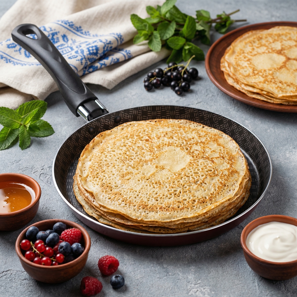 Пышные, пористые и очень ароматные. ✅ молоко тёплое — 500 мл ✅ сухие дрожжи — 7 г ✅ яйца — 2 шт. ✅ сахар — 2 ст. л. ✅ соль — ½ ч. л. ✅ мука — 300–350 г (по консистенции) ✅ растительное масло — 2 ст. л. (в тесто) ✅ сливочное масло — для смазывания готовых блинов. ▪️ В тёплом молоке растворяем сахар и дрожжи, оставляем на 10 минут, чтобы появилась “шапочка”. ▪️ Добавляем яйца и соль, перемешиваем. ▪️ Всыпаем муку частями и размешиваем до консистенции густой сметаны. ▪️ Вливаем растительное масло, перемешиваем, накрываем и оставляем на 40–60 минут в тёплом месте. ▪️ Сковороду для блинов линейки LACE (Кружево) 🔵 купить на OZON 🟣 купить на WB хорошо разогреваем, смазываем тонким слоем масла перед первым блином. ▪️ Выпекаем блины на среднем огне: тесто наливаем чуть толще, чем на тонкие блинчики. ▪️ Готовые блины смазываем сливочным маслом и складываем стопкой. ✨ Получаются мягкие, “дырчатые” и очень уютные блины — идеальны для Масленицы и воскресного завтрака.