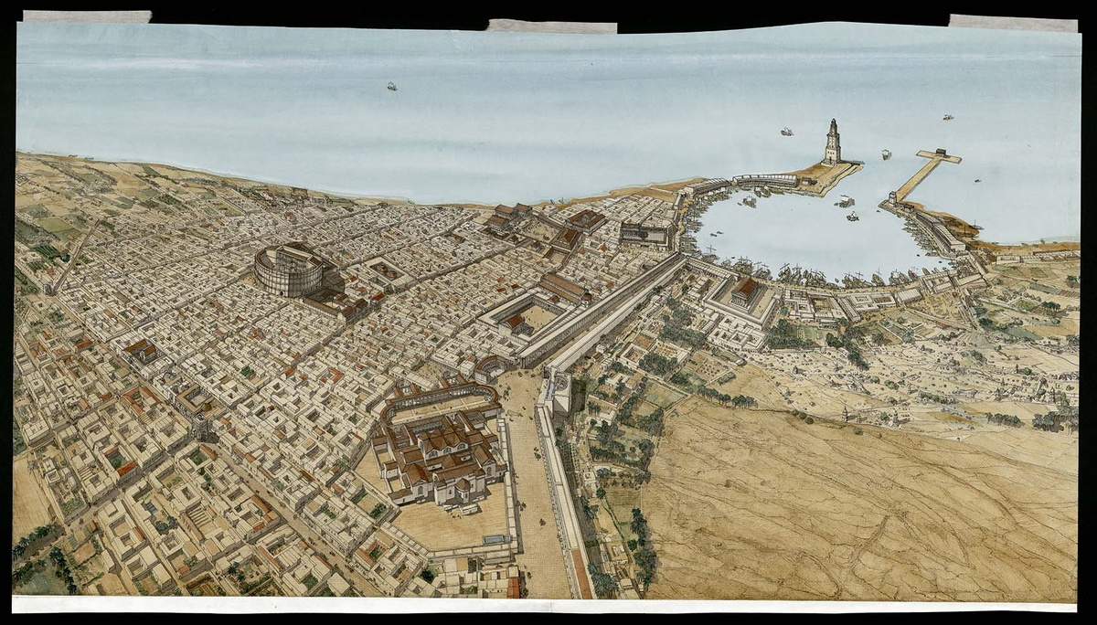 Развитие всяких технологий позволяет получать много дополнительной интересной информации. Если раньше, к примеру, античные города можно было увидеть или по телевизору (у Сенкевича, кстати, если кто не знал, мы с ним были лично знакомы - я возила "Клуб" в Иорданию в 1997 году) или в журналах о путешествиях, и материалов было мало, то теперь ситуация изменилась. Сейчас можно и снимки из космоса посмотреть. И фотографии из огромного количества самых разных источников. И видео с разных ракурсов. И узнать, как по предположению исследователей выглядело то или иное место раньше. Нашла несколько интересных фотографий. На них расположенные в Ливии руины древнеримского города Лептис Магна сверху. У меня про него был пост, ссылка на него будет внизу. Город находился на берегу Средиземного моря. Таким его нарисовал известный реконструктор древних городов, алжирский француз Жан-Клод Голвин. Я уже много раз показывала его работы. Художник нарисовал разные районы этого памятника. И дал нам понять,