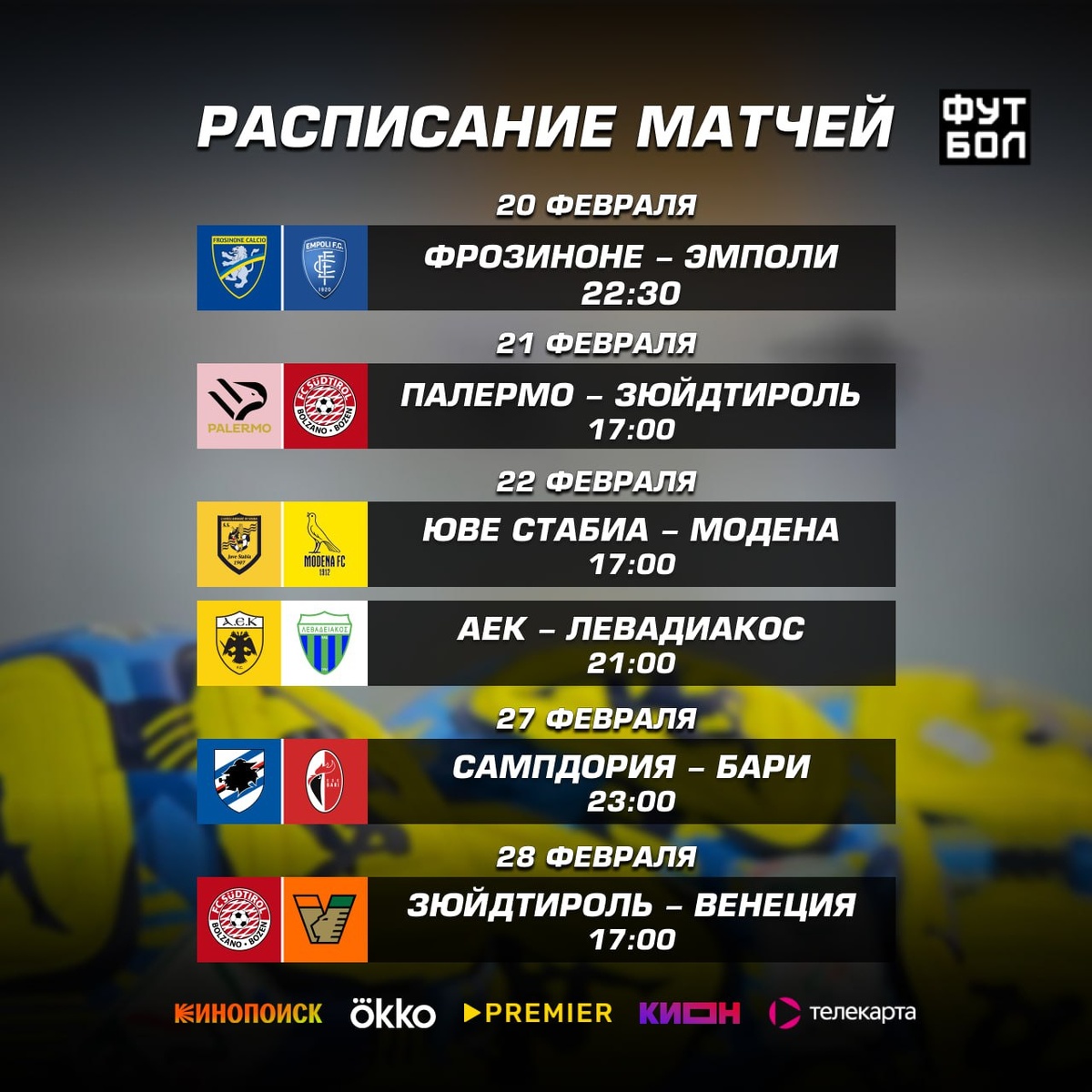 » 20 февраля в 22:30 Фрозиноне-Эмполи 21 февраля в 17:00 Палермо-Зюйдтироль 22 февраля в 17:00 Юве Стабиа-Модена 22 февраля в 21:00 АЕК-Левадиакос 27 февраля в 23:00 Сампдория-Бари 28 февраля в 17:00 Зюйдтироль-Венеция Смотрим принципиальную дуэль Фрозиноне — Эмполи, понаблюдаем, как Палермо будет доказывать свой статус на родном поле против Зюйдтироля, увидим упорную битву Юве Стабии с Моденой, АЕК примет Левадиакос, Сампдория и Бари устроят жаркую рубку за очки, а завершит всё выезд грозной Венеции к упрямому сопернику. 📺 Это мы смотрим!