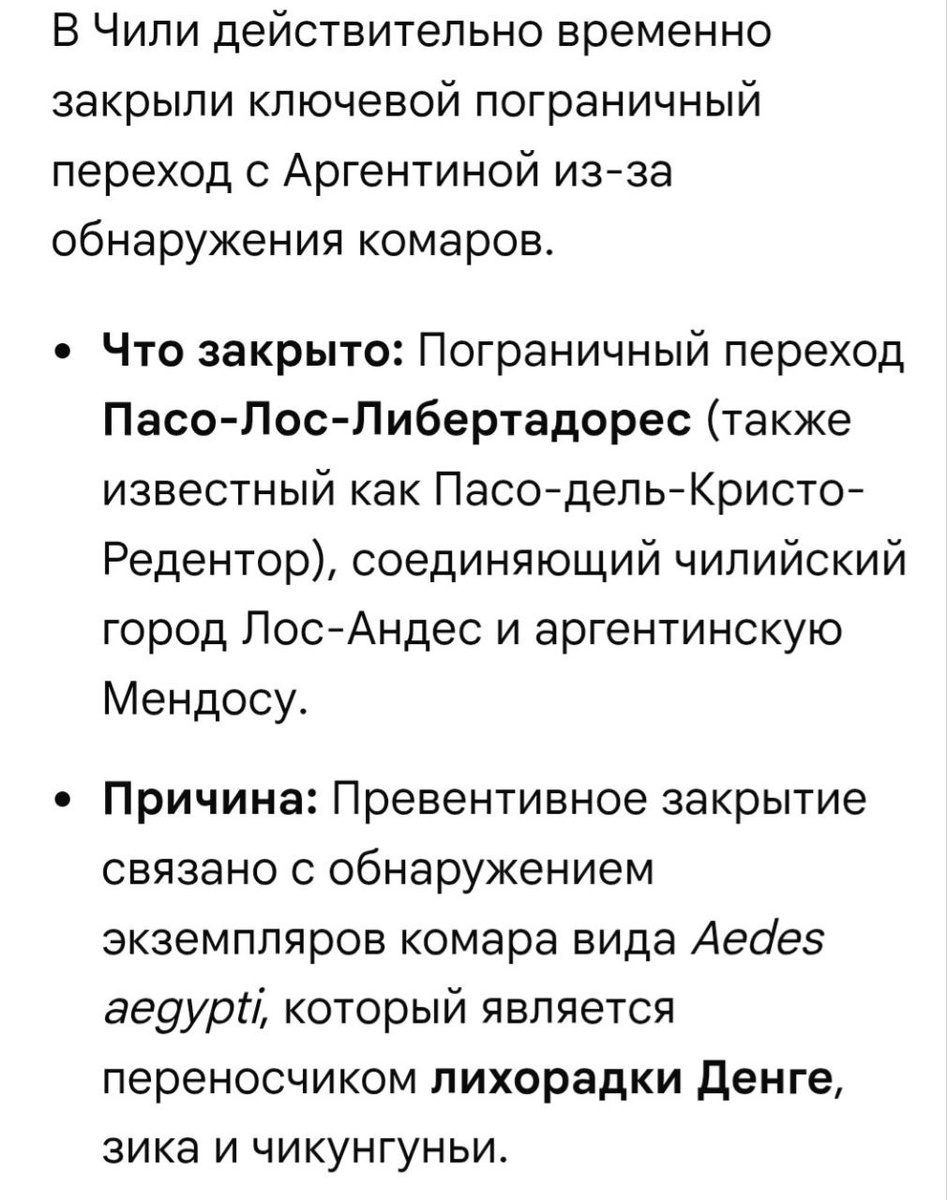 Правда, сегодня её уже открыли. 😁 Всё из-за обнаруженных комаров Aedes aegypti. Как я рассказывала, в Чили вообще почти нет опасных насекомых, змей и тд, и чилийцы очень следят за такими случаями, у них через границу даже комар не проскочит. 😃 Кстати, такие комары прекрасно живут у нас в Сочи, их тут обнаружили ещё в 2011-2016 годах, и их ареал обитания растет, включая Крым и Предкавказье. Но как говорят, у нас они здоровые и ничего не переносят. 😄