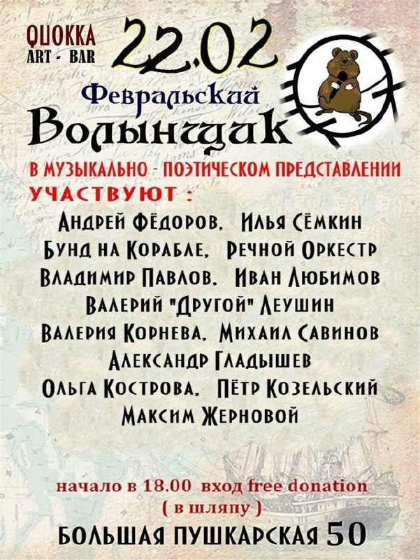 Тут в воскресенье 22.02.26 раздают сборную концертную солянку. Бунд на корабле тоже будет.)