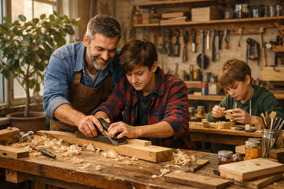 Мишка тут же сел рядом и слушал с открытым ртом, как дядя Гена рассказывал про шипы, пазы, столярный клей и то, почему дерево ведёт себя при влажности иначе, чем ожидаешь. Это была довольно техническая лекция, но Мишка не потерял нить ни на минуту.