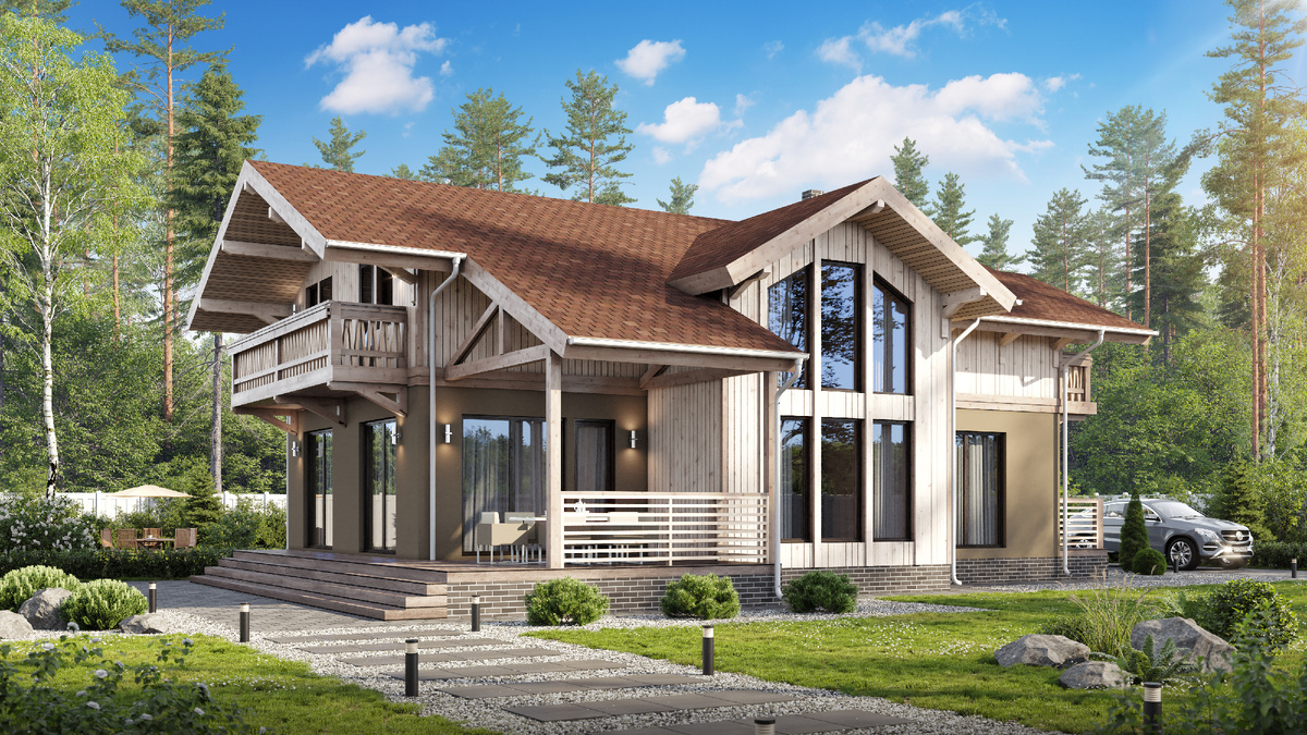 Этот проект выбирают те, кто ищет комфорт и основательность. Шале 289 идеально подойдет на роль родового гнезда для нескольких поколений. В таком доме будет писаться семейная история и закладываться собственные традиции. Расскажем о нем подробнее. Начнем с общих характеристик дома А теперь расскажем о планировке подробнее Благодаря зоне второго света в гостиной и крупноформатному остеклению, в дом попадает много естественного света. Гостевая комната на первом этаже позволит с комфортном разместить друзей или родственников, которые решат остаться на ночь. Мастер-спальня с собственной душевой, гардеробной и выходом на балкон подарит хозяину и хозяйке приватность и комфорт. Принимайте душ и собирайтесь на работу, не выходя из комнаты. Площадь кухни позволит не экономить пространство и сделать его максимально функциональным. Здесь можно установить гарнитур с большой рабочей поверхностью и двумя мойками, разместить шкафы для хранения. Так гораздо проще поддерживать порядок. Детские спальни