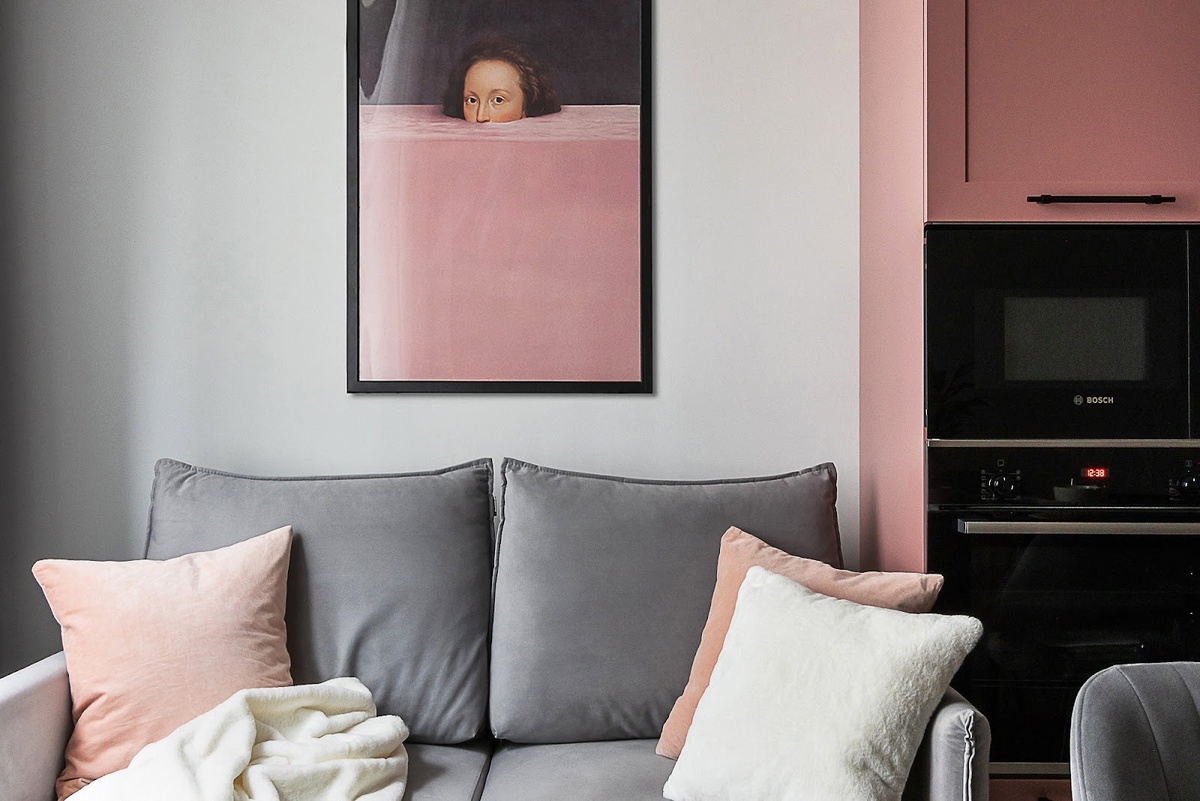 Площадь здесь небольшая, поэтому громоздкую мебель не использовали. Рабочий стол дополнили рядом навесных шкафов. Акцент интерьера — розовый диван Льери Мини от divan.ru.