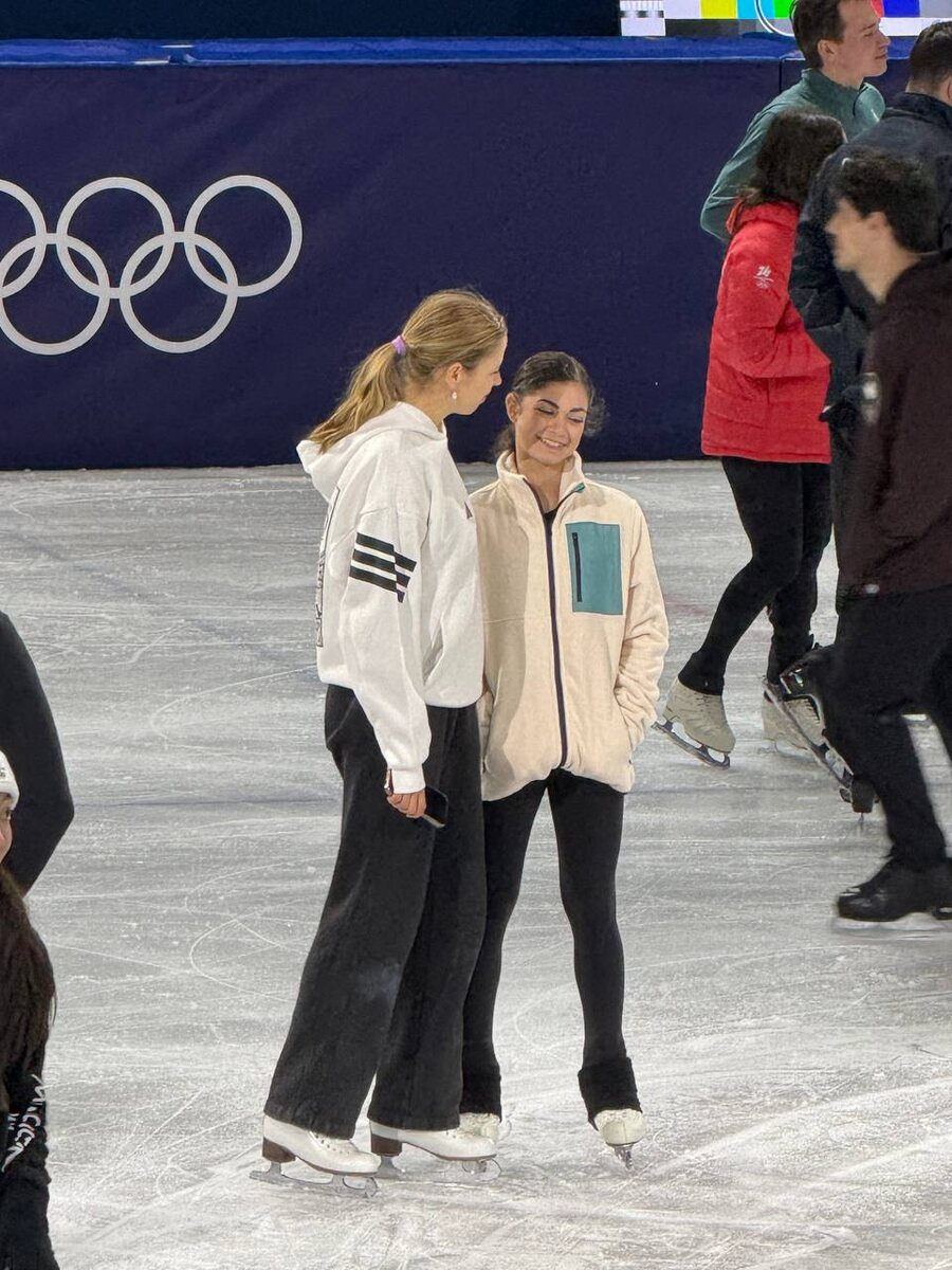 ! 20 февраля на олимпийской арене в Милане проводится репетиция показательных выступлений, на которые пригласили Петросян. После прогона одного из номеров легендарная фигуристка подъехала к Аделии и приобняла её. Журналист Константин Лесик сообщает, что Костнер что-то сказала Петросян. После этого российская фигуристка начала улыбаться. 📸 LESIK @russian_rt_sport