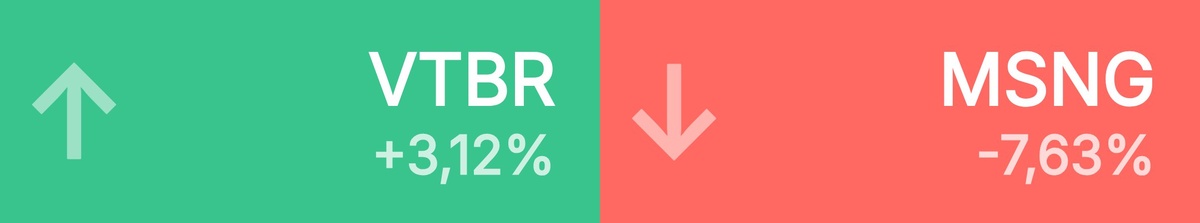 : Банк ВТБ • 88,18 ₽ • 3,12% Новатэк • 1 194 ₽ • 2,22% ЮМГ • 862 ₽ • 2,08% Дом.РФ • 2 192 ₽ • 0,93% МТС • 235 ₽ • 0,92% Астра • 261 ₽ • 0,91% Транснефть • 1 446 ₽ • 0,82% ТГК-1 • 0,01 ₽ • 0,79% Медикал Гр • 1 507 ₽ • 0,78% Норильский • 154 ₽ • 0,76% 🔻 Топ-10 лидеров падения среди крупнейших акций: Мосэнерго • 2,27 ₽ • -7,63% Лента • 2 047 ₽ • -1,94% Эн+ • 481 ₽ • -0,96% РуссНефть • 117 ₽ • -0,94% Озон • 4 780 ₽ • -0,79% Юнипро • 1,62 ₽ • -0,74% ЭсЭфАй • 920 ₽ • -0,69% ГК Самолет • 850 ₽ • -0,61% ЭЛ5-Энерго • 0,50 ₽ • -0,56% М.Видео • 74,05 ₽ • -0,54%