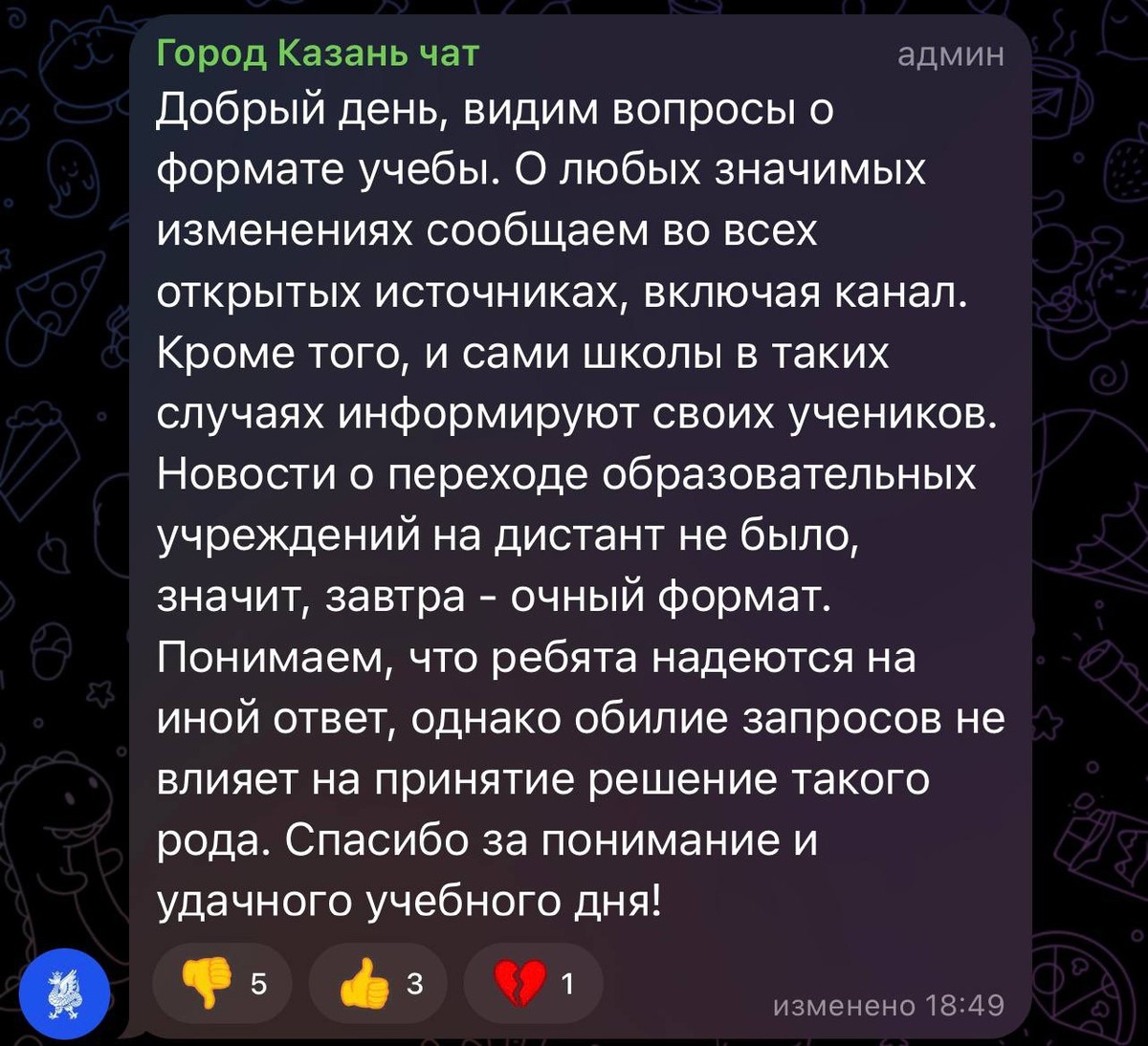 Десятки сообщений с просьбой перевести завтра школьников на дистант, оставленные казанцами в чате мэрии города, ни к чему не привели