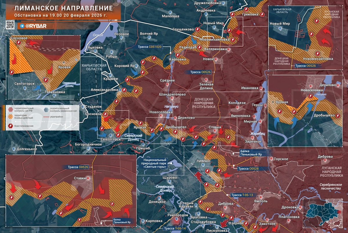 Группировка войск «Запад» продолжает наступательные действия на Лиманском направлении. Успехи зафиксированы на широком участке фронта к северу от города. 🔻Где удалось продвинуться? 🔸Подразделения ВС РФ атакуют в пределах Редкодуба, отразили атаки украинских формирований в Коровьем Яру, продолжаются бои за Александровку. 🔸Основные изменения линии соприкосновения происходят на рубеже Святогорск — Лиман, где российским подразделениям удаётся продвигаться на нескольких участках. 🔸В районе Святогорска противник выбит как минимум из части Соснового, что открывает возможность продвижения к городу с севера. Говорить о полноценном охвате пока рано: в лесах не так много возможностей закрепиться, да и действуют преимущественно малые штурмовые группы. 🔸За Яровую продолжаются бои, значительная часть населённого пункта остаётся в «серой зоне». С восточных окраин противник предпринимал контратаки в сторону Новосёловки и, по некоторым данным, смог выйти к застройке. 🔸Ожесточённые бои идут в райо