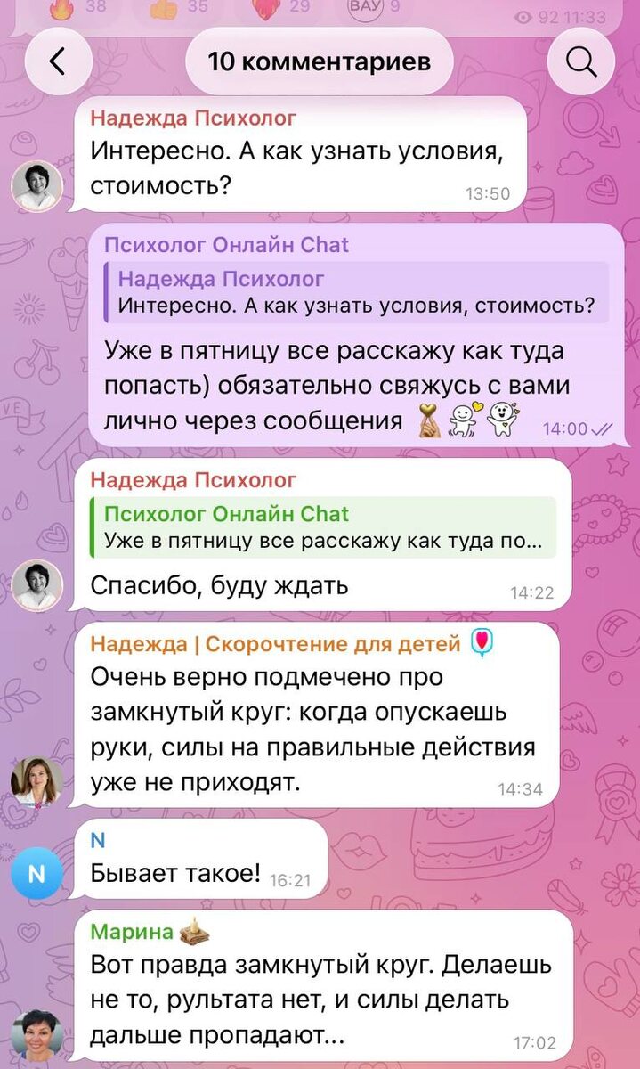!) Уже распланировала челлендж по работе со страхами, который мы начнем с 1 марта, прям с самого открытия клуба!) Но попасть к клуб уже можно прямо сейчас и по минимальной цене 💸 потому что Закрыты клуб только начинает свое существование 🆕🆕🆕 Моя задача в этом клубе - помочь тебе найти причины твоего выгорания и справиться с ними. Там я постоянно поддерживаю связь с тобой, как твой личный психолог. Клуб будет работать по ежемесячной подписке и если ты зайдешь туда прямо сейчас, то твоя подписка будет активна 2 месяца, а это больше 8 недель. Представь, что все эти 8 недель ты работаешь с психологом лично. За 8 недель можно сделать большой шаг, чтобы выйти из выгорания и продолжать работать с новыми силами к своему любимому делу. Если ты хочешь работать без выгорания к любимому делу пиши «хочу в клуб» мне в личные сообщения, я отправлю всю подробную информацию