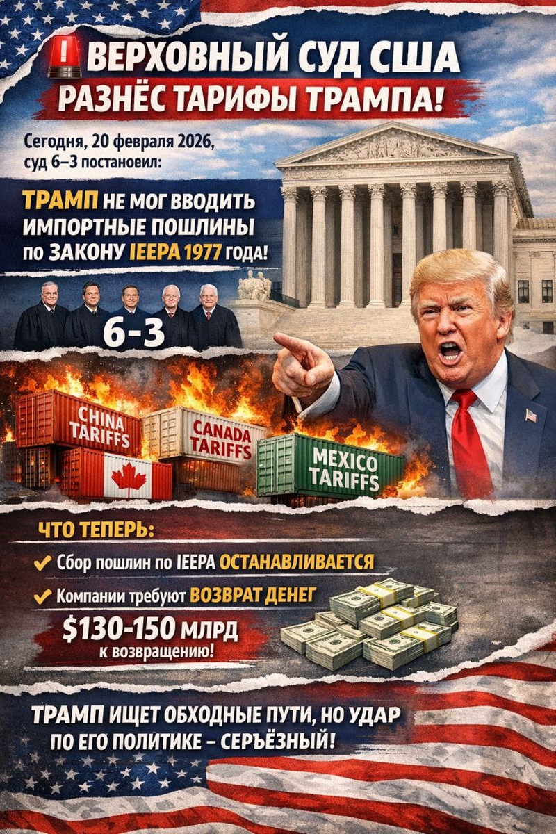 ! 20 февраля 2026 суд 6–3 постановил: Президент не имел права вводить масштабные импортные пошлины по Закону IEEPA 1977 года. Этот закон — для чрезвычайных ситуаций, а не для тарифов на весь импорт. Речь о «зеркальных», «фентаниловых» и других глобальных пошлинах 2025 года против Китая, Канады, Мексики и десятков стран. Компании требуют вернуть уже уплаченные деньги, сумма которых достигает — $130–150 млрд. Трамп ищет обходные пути, но сегодняшнее решение — серьёзный удар по его тарифной политике. #Трамп #Тарифы #ВерховныйСуд #США 🔔 Подпишись | 👍 Поставь реакцию | ♻️ Репост