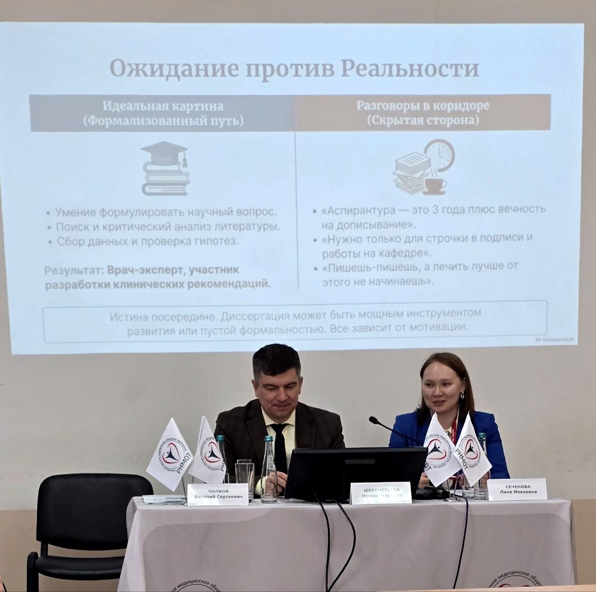 " Сегодня стала частью образовательного проекта "школы молодых терапевтов" РНМОТ. Российское научное медицинское общество терапевтов уделяет большое внимание поддержке молодых специалистов — студентов, ординаторов и врачей, только начинающих свой профессиональный путь. Одно из мероприятий РНМОТ для студентов прошло сегодня в Барнауле, в Алтайском государственном медицинском университете. О своем выступлении расскажу завтра. А сегодня хочу поделиться слайдами с «Научного батла: защита кандидатской за и против». Батл виртуозно провели: Чулков Василий Сергеевич, Председатель секции «Молодые терапевты» РНМОТ и Жарова Мария Евгеньевна, Секретарь секции «Молодые терапевты» РНМОТ Вдруг, вы еще не решили, нужна ли вам кандидатская 😌