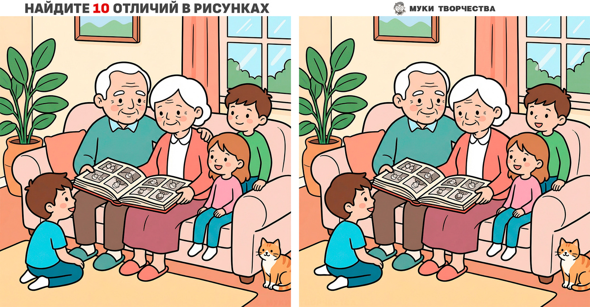 Сегодня задачка на внимание с уютной атмосферой. Две похожие картинки, где бабушка с дедушкой показывают старый фотоальбом внукам и рассказывают весёлые истории из своей молодости. Но в одной картинке художник специально спрятал 10-ть отличий. Ваша задача найти все отличия не прибегая к подсказке. Которая будет в конце этой статьи. Для максимальной пользы от такой гимнастики для ума используйте подсказку только, чтобы проверить свои предположения. Желаю удачи в поисках и не забудьте поделиться этим упражнением с тем, кому оно может быть интересно. Горизонтальная версия теста: Добрые воспоминания в кругу семьи Вертикальная версия теста: Добрые воспоминания в кругу семьи Оу! Тут Ещё Больше Задачек На Внимание: НИЖЕ ОТВЕТ-ПОДСКАЗКА: