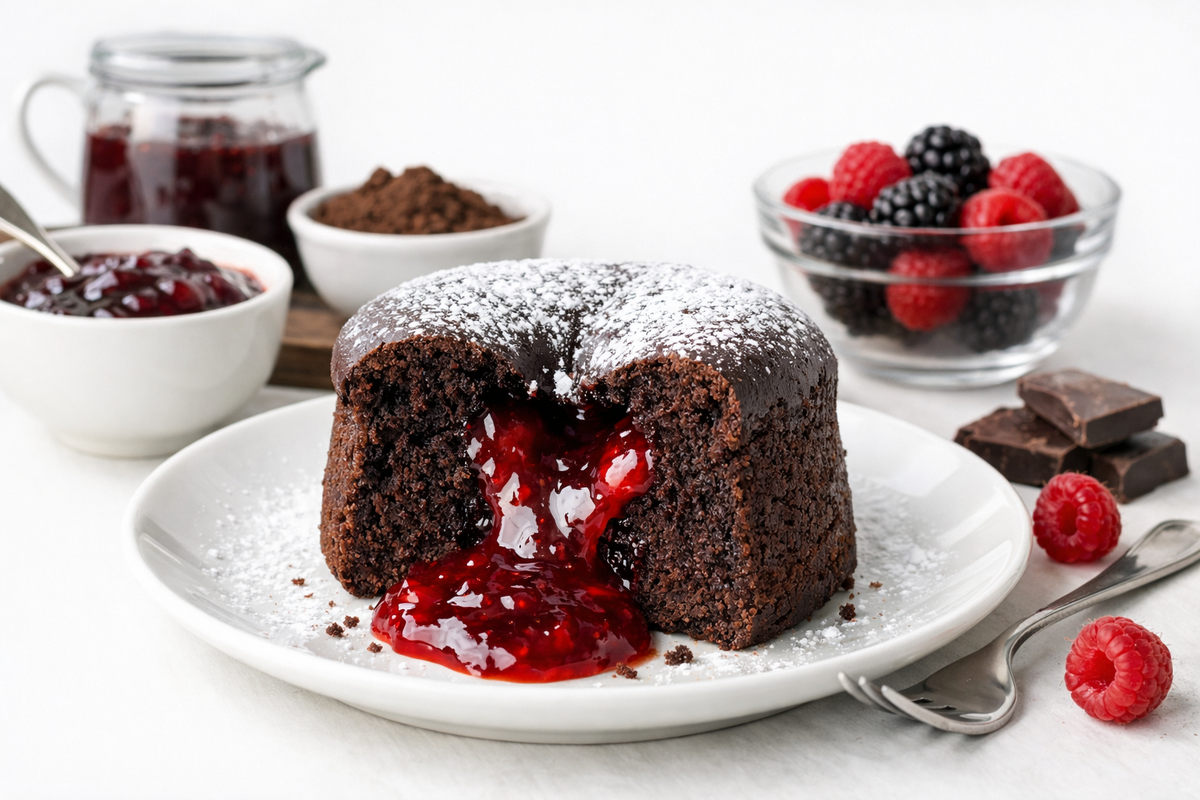Снаружи - плотная шоколадная корочка, внутри - мягкий влажный мякиш и горячая сладкая "лава" из варенья. Такой кекс выглядит дорого, готовится просто, а на фото в разрезе собирает внимание с первого взгляда.