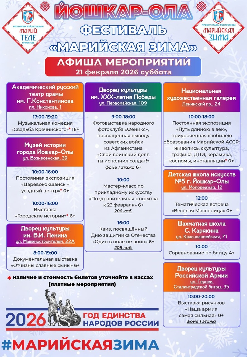 🪂 В ближайшие выходные, с 21 по 23 февраля, жителей и гостей города ждет насыщенная программа, в которой нашлось место и военно-патриотическим мероприятиям, и традиционным масленичным забавам. В воскресенье, 22 февраля, гуляния развернутся сразу на нескольких площадках города. Так, на площади имени В.И. Ленина в 17:00 начнется «Масленица на катке» с показательными выступлениями фигуристов, народными играми и ростовыми куклами. Всех гостей угостят чаем и блинами. Ключевым спортивным событием выходных станет кубок городского округа «Город Йошкар-Ола» по парашютному спорту, который пройдет 23 февраля в 13:30 на аэродроме Павлово. Зрелищные прыжки с парашютом станут яркой точкой в череде мероприятий, посвященных Дню защитника Отечества. 🌡 Организаторы напоминают, что проведение уличных мероприятий зависит от погоды: при температуре ниже -15°C они могут быть отменены. ❄️ Фестиваль «Марийская зима» стартовал 13 декабря 2025 года. Он реализуется по инициативе Главы Марий Эл Юрия Зайце