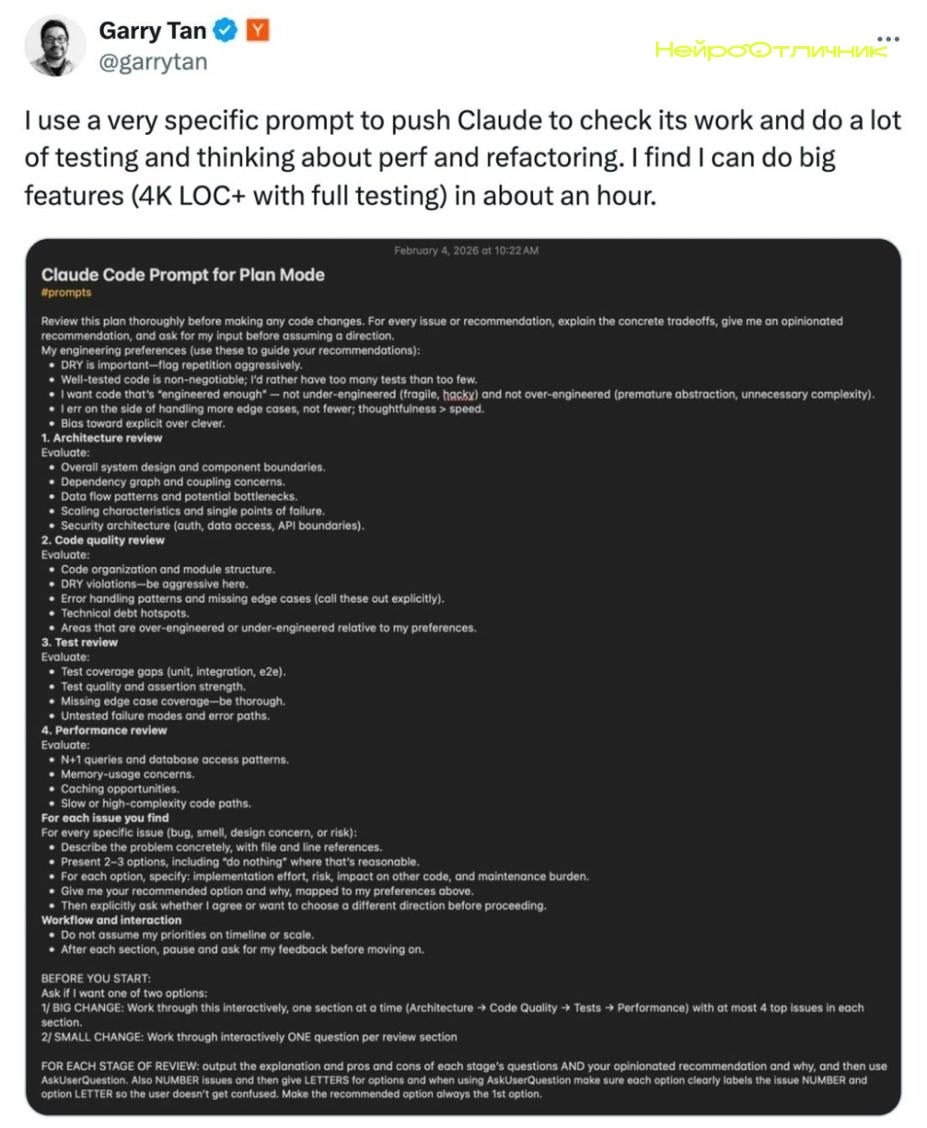 ? Теперь Claude пишет код как опытный разработчик: он строит архитектуру, ловит баги, предлагает исправления и даже требует одобрения плана перед стартом работы. Команда из Y Combinator создала промпт, с которым Claude генерирует более 4000 строк кода почти без ошибок — и всё это с анализом рисков и затрат для каждого решения. Claude оценивает архитектуру, качество, тесты, производительность и всегда спрашивает: это серьёзный баг или быстрое исправление? Подробности можно узнать у Sam Altman в Twitter: https://twitter.com/SamAltman/status/1639647258229757952 Как думаете, скоро ли ИИ заменит сеньоров? Подпишитесь, чтобы не пропустить новинки! #технологии #искусственныйинтеллект #программирование Нейро Отличник www.neurootlichnik.ru