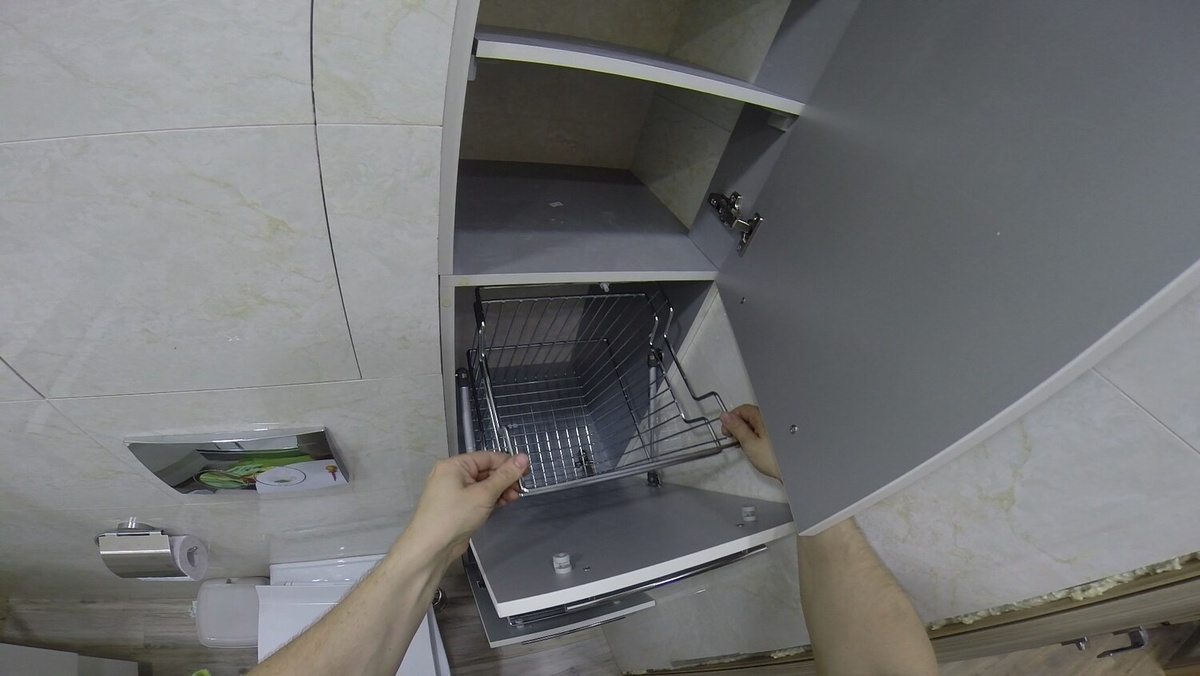 Стоит задача установить встроенный распашной шкаф в ванную комнату. Необходимо разместить в нём принадлежности для мытья, бытовую химию и вещи, предназначенные для стирки. Мы спроектировали подходящий вариант и принялись за установку. Принято было решение изготавливать изделия из ЛДСП Egger в цвете "Серый металлик", но с белой контрастной кромкой. Сначала соберём каркас для откидных полок, предназначенных для металлических корзин, в которые планируется складывать грязное и чистое бельё для стирки. Конструкцию собираем на мебельные стяжки и конфирматы. Устанавливаем на законное место тумбу и приступаем к разметке и сверлению стен помещения для крепления полок и фальшпланок. Устанавливаем фальшпланки в продолжении фасадной линии. Кромка также белая. Крепления на дюбель и саморез. Монтируем металлические уголки для крепления полок. Уголки закрываются ПВХ накладками. Устанавливаем полки с заданным интервалом. Крепим полки к металлическим уголкам. Прикрепляем фасадный элемент, с помощью меб