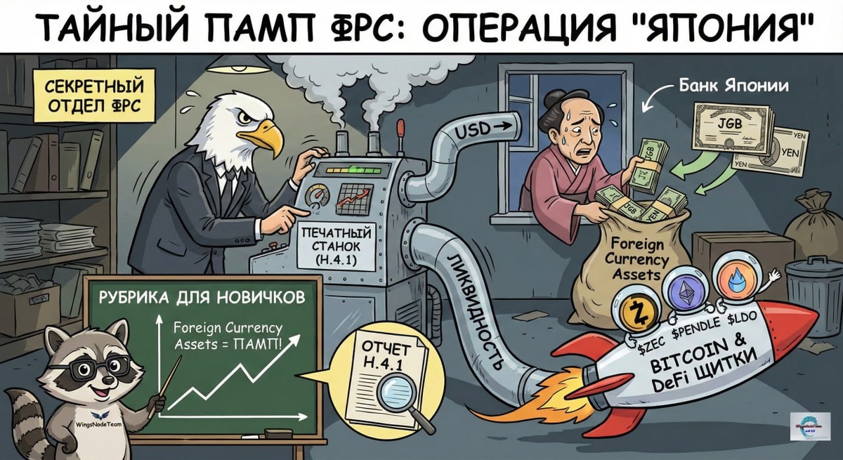 ) Поясняем за макро и крипту: Часть 2. Ищем сигналы к пампу Продолжаем наш макро-разбор от WingsNodeTeam! В прошлом посте мы выяснили, что ФРС неизбежно включит печатный станок. Но откуда именно придет ликвидность? Ответ кроется в Японии. Доходности японских 10-летних гособлигаций (JGB) стремительно растут (пробивали 2.29%, сейчас в районе 2.11%), а иена слабеет. Проблема в том, что японские инвесторы держат колоссальный портфель казначейских облигаций США на $2.4 трлн. Если Банк Японии окончательно потеряет контроль, японцы начнут массово продавать американские бумаги, чтобы переложиться в свои. Это вызовет катастрофический рост стоимости заимствований для США. Чтобы спасти свой долговой рынок, ФРС придется вмешаться в японский кризис. И сделают они это скрыто. 👀 Как нам это отследить? Мы внимательно мониторим еженедельный отчет ФРС (форма H.4.1). Там нас интересует одна конкретная строка - "Foreign Currency Denominated Assets" (Активы в иностранной валюте). Механика следующая: