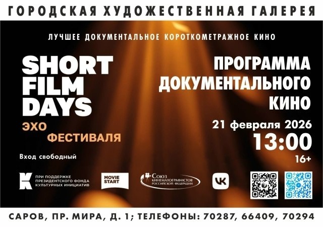 ! Художественная галерея приглашает на программу "Лучшее документальное короткометражное кино". 21 февраля в 13:00 саровчанам покажут 4 лучших документальных короткометражных фильмов последних лет: «Громко и честно», «Кретинопись», «Там, где дом» и «Теплая жизнь». Кинопоказы бесплатные, регистрация не требуется.