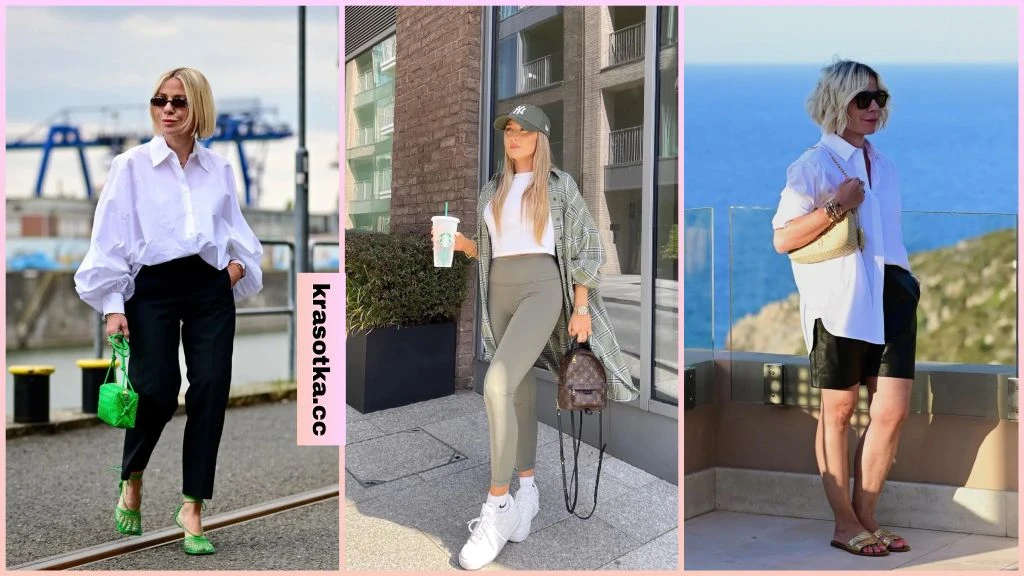 Стиль оверсайз продолжает набирать популярность. Женщины давно оценили удобство свободных вещей , которые не сковывают движений и обеспечивают комфорт в течение всего дня. Одежда свободного фасона выглядит женственно и стильно. В этой статье мы расскажем, с чем модницы носят самые популярные свободные рубашки. Логичное и популярное сочетание – это рубашка и брюки. Но в случае свободного фасона стоит выбирать определённые модели брюк. К примеру, классические изделия со стрелкой лучше оставить для создания строгого лука, а вот легкие, свободные, расклешенные модели идеально будут сочетаться с любой рубашкой в стиле оверсайз. Читайте также: 10 вдохновляющих примеров с чем носить брюки-бананы, которые стоит взять на заметку в [year] году Модницы уже давно взяли на заметку образ, в котором можно выглядеть стильно, кокетливо и чувствовать себя при этом максимально комфортно. Облегающие легинсы, топ или футболка с накинутой свободной рубашкой – это образ активной дамы. Самый популярный образ