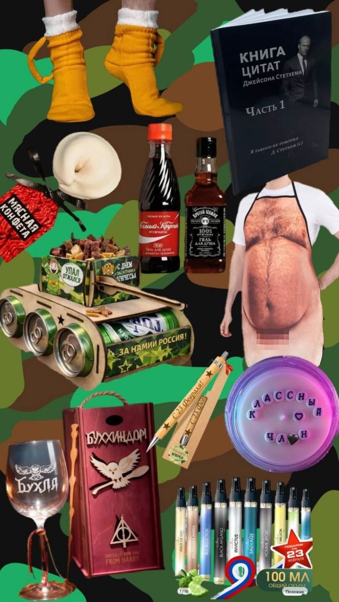 💪🏻 Книга цитат Джексона Стэтхема Я такого не говорил (с) Даже я такую захотела! 💪🏻 Гели для душа Виски+кола Если масик — веселый алкоголик 💪🏻 Набор духов-подделок 10х10 мл Когда хочется, чтобы мужик пах вкусно и дорого, но денег не хвататЪ! 💪🏻 Набор бокал Бухля и коробка Буххиндор Если алкаш миллениал не вырос и все ещё любит Гарри Поттера 💪🏻 Неожиданно пошлая свечка И это еще цензурный вариант! 💪🏻 Леденец-пельмень С фруктовым вкусом, а жаль 💪🏻 Фартук-пузень Для тех, кто активно стремится к пивному пузику 💪🏻 Носки пивная кружка Для тех, кто умеет держаться на ногах с пивом 💪🏻 6 подарков: деревянные ручки с открытками Дёшево и сердито! 💪🏻 Мини-бар в виде танка Для ветеранов пивных войск По запросу «подарок на 23 февраля» чуть ли не каждый второй товар связан с алкоголем: наборы для приготовления настоек, рюмки, бокалы, фляжки, мерч с принтами на тему алко и т.п. Остальное — носки, футболки, гели для душа, штучки для машины. Что лучше: носки, гель для душа,