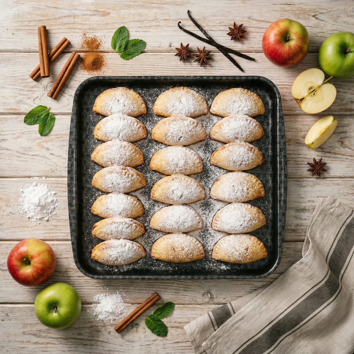 Нежное творожное тесто, пряная яблочная начинка и щедрый слой сахарной пудры — идеальное печенье «к чаю». Для теста: ✅ творог мягкий — 200 г ✅ сливочное масло — 100 г ✅ сахар — 80–100 г ✅ яйцо — 1 шт. ✅ разрыхлитель — 1 ч. л. ✅ ванильный сахар — 1 пакетик ✅ мука — 260–300 г (по консистенции) ✅ щепотка соли Для начинки: ✅ яблоки — 3–4 шт. (средние) ✅ сахар — 2–3 ст. л. ✅ корица молотая — ½–1 ч. л. ✅ лимонный сок — 1 ст. л. (по желанию) Для подачи: ✅ сахарная пудра — для посыпки ▪️ Творог, мягкое сливочное масло, сахар, ванильный сахар, яйцо и соль соединяем в миске и перемешиваем до однородности. ▪️ Всыпаем разрыхлитель и частями подмешиваем муку. Замешиваем мягкое, не липкое тесто. Если липнет к рукам — подсыпаем ещё немного муки. ▪️ Заворачиваем тесто в плёнку и убираем в холодильник на 20–30 минут. ▪️ Яблоки очищаем от сердцевины, нарезаем мелкими кубиками. ▪️ Посыпаем сахаром, корицей, при желании добавляем лимонный сок, перемешиваем и даём постоять 5–10 минут. ▪️ Духовку разогрева